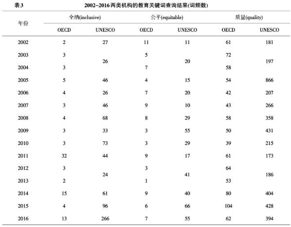 从UNESCO的“世界文盲地图”,到OECD和世界银行的“人力资本提升”计划,教育在国家发展中扮演了重要的角色。需注意的是,教育不仅仅是经济复苏和繁荣的重要机制,还是人的基本权力。由联合国主导的国际组织一直未曾忽视教育作为基本人权的议题。如UNICEF在1989年通过的《儿童权利公约》界定了儿童从出生到发展享有的各种权利。UNESCO的《全民教育全球监测报告》几乎每年都对人之发展的基本权利有所回应。如2003年的“性别教育”、2006年的“识字教育”、2009年的“消除不平等”、2011年的“武力冲突与教育”等都包含着对人类命运共同体的关怀。以OECD的《教育概览》和UNESCO的《全民教育全球监测报告》为比较对象,发现“全纳”“公平”“质量”的诉求早已蕴含在历年实践中,且UNESCO在三个维度上均表现出更多的关注,详见表3比较分析。