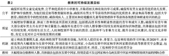 2015年是教育发展“千年目标”的收官之年,实现性别平等、普及初等教育等6大目标并未如期兑现。联合国2015年的数据显示发展中地区的小学入学率达到91%,小学教育适龄儿童失学人数为5700万。适龄失学儿童中,一半以上来自撒哈拉以南非洲地区。在小学阶段辍学的儿童中,有50%生活在受冲突影响的地区。世界上有1.03亿青少年缺乏基本的读写算技能,其中60%为女性(UN,2015)。故《仁川宣言》吸取了人文主义教育发展观,以人权和尊严为基础,强调教育的可持续发展目标(详见表2):