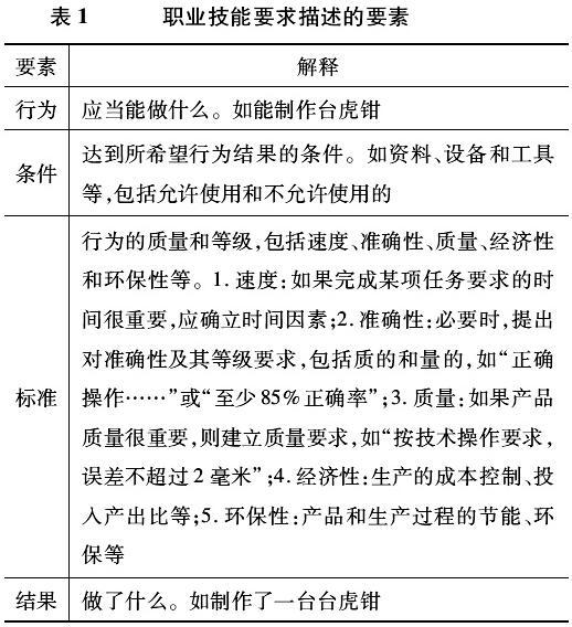 职业技能等级证书最终是要满足企业需求和个体就业需求。衡量职业技能等级标准应该是从业者完成某一工作岗位关键工作领域的典型工作任务的质量。通俗讲,企业衡量员工职业技能水平的标准就是看员工“能做什么”(行为与结果)、“怎么做的”(条件)、“做的怎么样”(质量或者标准),也就是说行为、条件、标准、结果可以作为衡量职业技能水平或描述职业技能要求的四个要素(表1)。[9]按照四要素进行描述,如“发动机拆卸”这一职业活动的职业技能要求可描述为“能根据发动机拆装技术规程,与班组成员合作,合理使用工具、设备,规范完成发动机拆卸作业”。