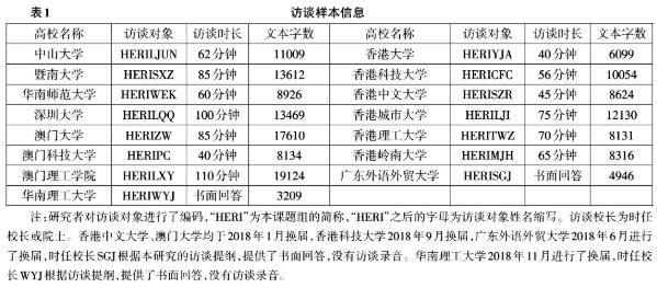质性研究是以研究者本人作为研究工具,在自然情境下,采用多种资料收集方法,对研究现象进行深入的整体性探究,从原始资料中形成结论和理论[27]。本研究的目的是探索粤港澳大湾区发展上升为国家发展战略的新情境下,湾区高等教育融合发展中的制度变迁问题以及构建一个理论框架解释湾区高等教育融合发展的前因与后果。我们认为扎根粤港澳高等教育发展实践,收集有办学经验的大学校长的一手数据有助于寻求问题解决的答案。因此,基于质性研究扎根理论的研究方法更适合于本研究。
