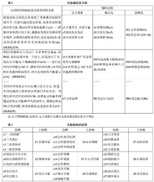 主轴编码旨在归纳出更抽象的主范畴,并建立范畴、主范畴之间的联系,范畴之间的联系包括相似关系、因果关系等。在开放编码阶段获得的27个范畴处于分散状态,它们之间的关系尚不明确:在主轴编码阶段,笔者对27个范畴进一步归纳,得到“宏观环境”“微观环境”等9个主范畴,进而建立起如表3所示的范畴、主范畴之间的联系。如“z1‘一国两制’”“z2三关税区”“z3三法律体系”“z4三教育体制”4个范畴,被归纳为“Z1宏观环境”主范畴。
