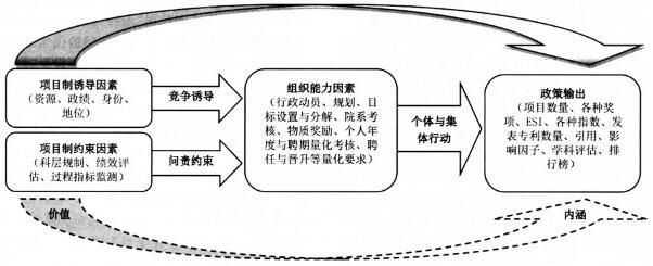 基于上述分析,本文在此不妨将结论略作概括如下:宏观政策的项目制类市场与行政逻辑的嵌套,促成了高校应对政府绩效考核与行政问责的一种新型政策变通行为,因此,项目制政策实施构成当下我国高校组织变迁的主要外因;为争取项目与应对项目制考核需求,以获得资源与身份的双重优势,高校组织属性发生变异,具有越来越突出的(指标)生产性与功利性组织特征;在规划目标与具体指标引导下的高校基层与教师个体行动,一方面表现出理性选择的利益偏好、“搭便车”和高风险创新研究规避取向,另一方面又因为自主空间压缩和功利性追求而承受内在的价值冲突,出现一定的失范性身心表征。最后,政策实施者的工具偏好与微观层面行动者的价值承诺存在明显偏离,一方的选择性事实判断与另一方基于直观体验的价值判断不相吻合。这其实也表明了政策设计与实施过程中行政意志的强势,而其他各方参与程度明显趋弱,最终结果反而是稀释了近年来府校关系层面的放权、高校内部权力中心下移与“去行政化”等治理方式改革的效果,甚至出现干预更多、管得更细的趋势。