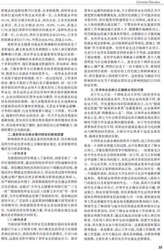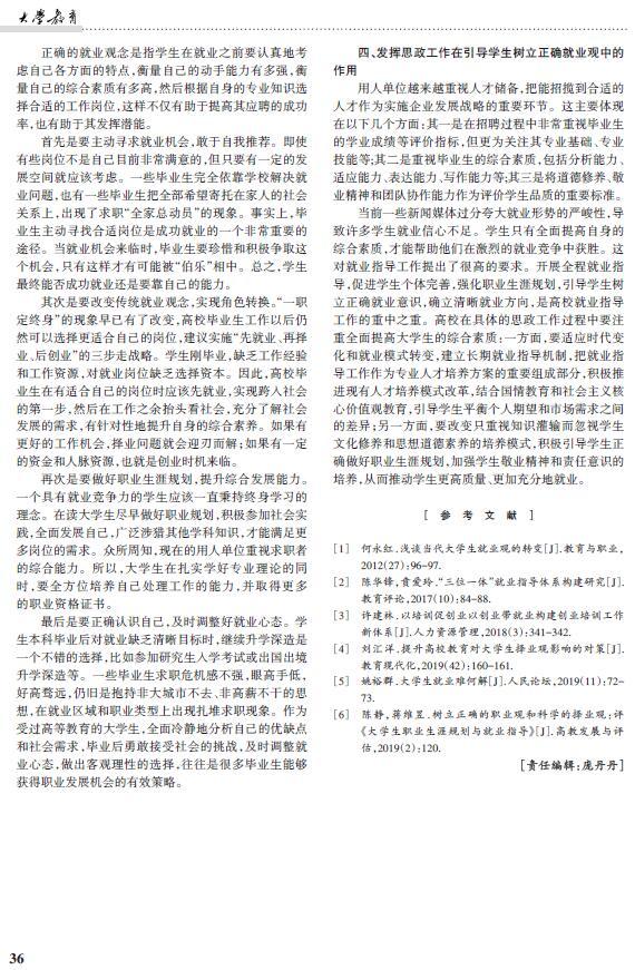 摘要:就业是最大的民生。高校毕业生就业是民生之本、民安之策。2019年,广东省相关部门印发文件,给予高校毕业生与用人单位更多双向选择的机会,同时也规定本科生的择业期为毕业两年内。文章从某应用型高校工商管理类优秀毕业生样本的三轮就业谈话及实际就业情况中出现的就业意识转变出发,对其宏观、微观的影响因素做了就业数据分析,提出了引导学生树立正确就业观的四点对策,同时也提出加强思政工作在引导学生树立正确就业观中发挥的重要作用。