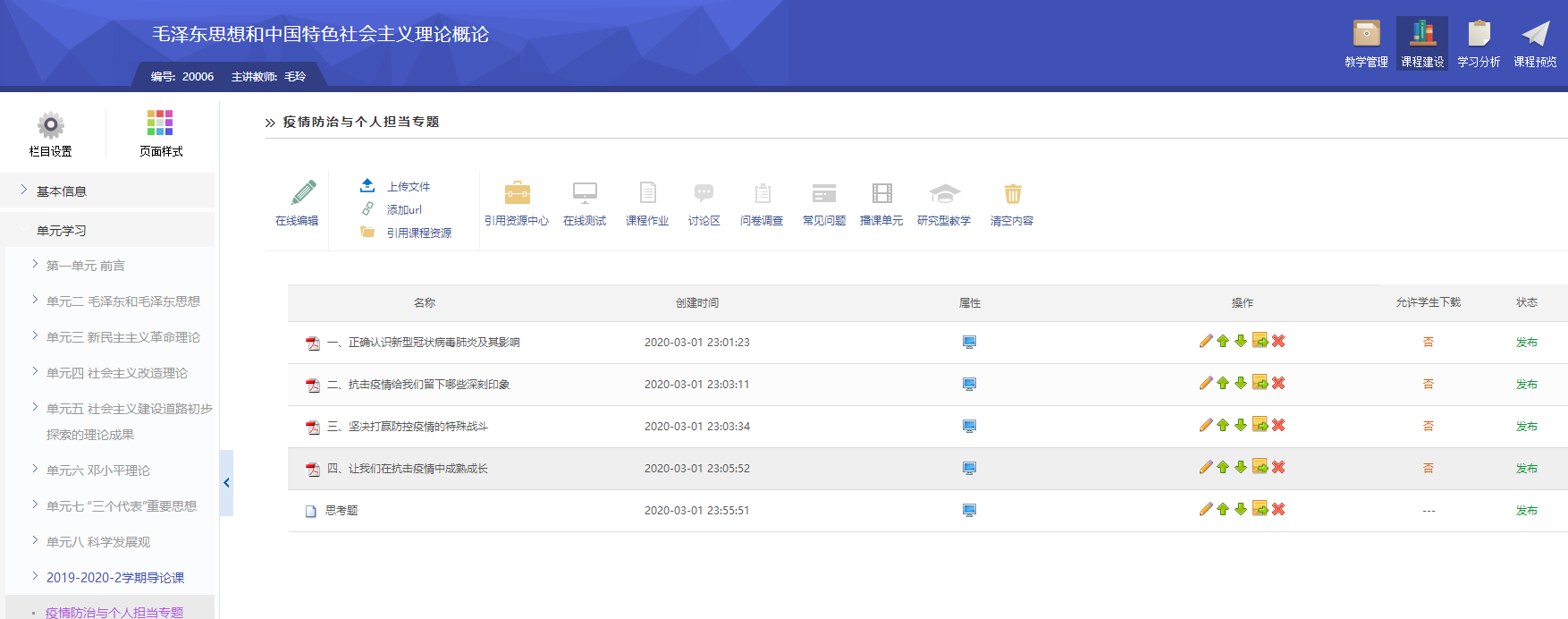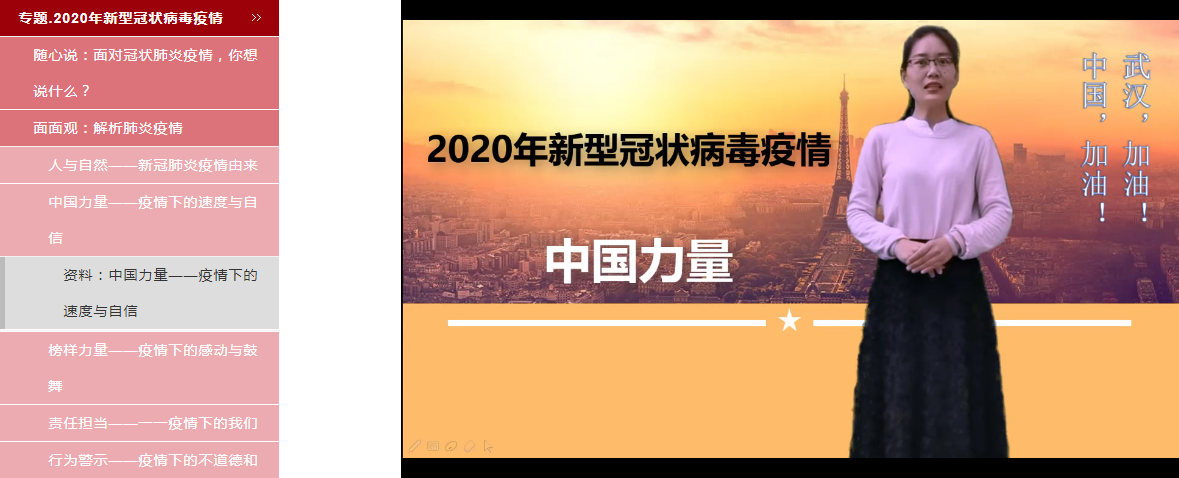 上午8:00至8:30,马院教师向学生发布学习任务和疫情防控专题材料,上万学生在开学的第一天或利用电脑、或利用手机同时上线,认真观看教学视频、积极学习防疫知识、踊跃讨论热门话题。为了更好地发挥思政课在凝聚共识、坚定信心、统一行动方面的作用,马院的老师们不断挖掘在战“疫”中涌现出的先进人物事迹、典型故事,从“人与自然”、“经验与教训”、“责任与担当”、“修德与养心”等层面展开线上教学,对学生进行了一场疫情防控教育、生命教育、爱国主义教育、社会责任感教育、价值观教育,带领学生认真反思人与自然的关系、分析抗疫斗争中的道德与法律问题,领略中国特色社会主义制度的显著优越性,助力学生进一步坚定“四个自信”,培养学生甘于奉献、勇于担当的精神品格。