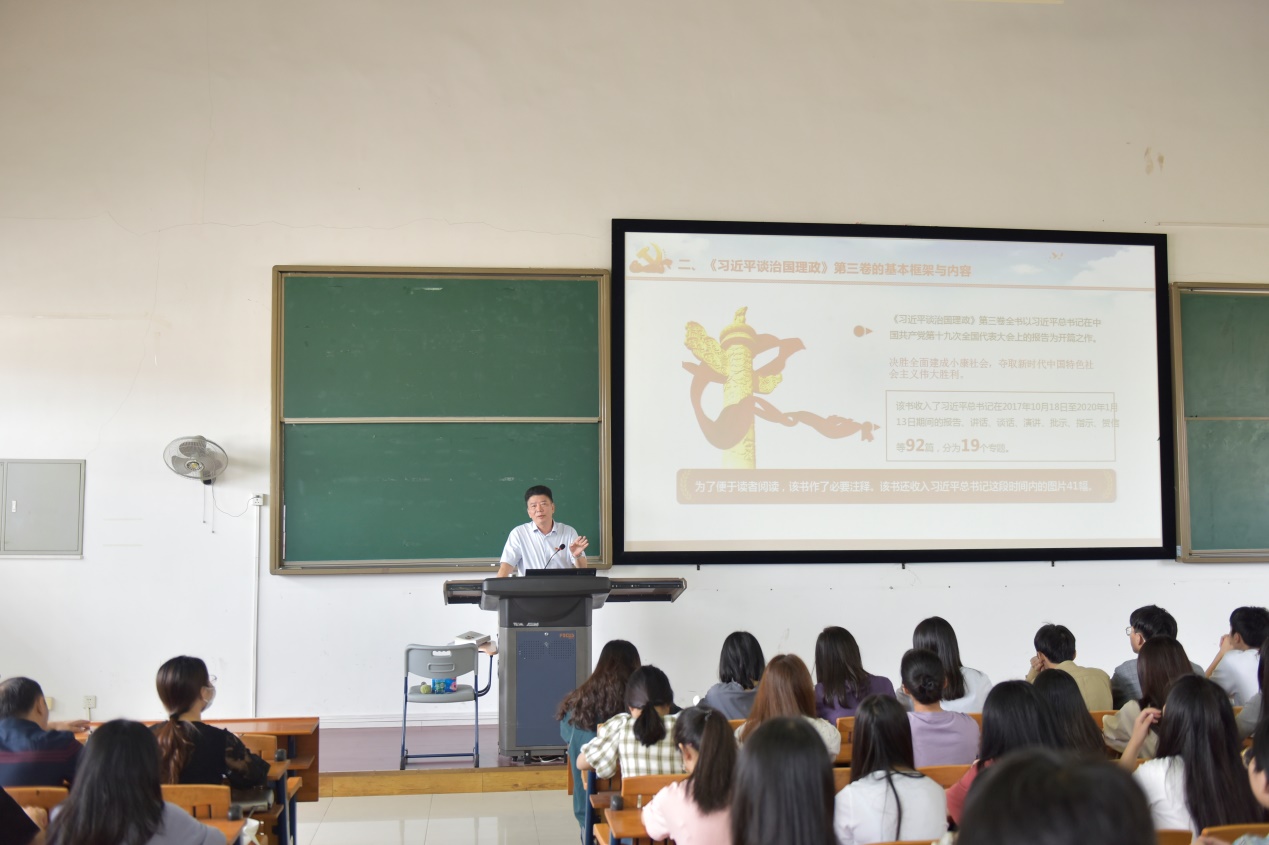 汤才讲课的主题是“学习贯彻《习近平谈治国理政》第三卷”。围绕着《习近平谈治国理政》第三卷这个第一议题,从该著作的出版背景、基本框架与内容、出版重要意义、掀起学习热潮等几个方面,为我们讲授了一堂生动、精彩、深刻的思想政治理论第一课。