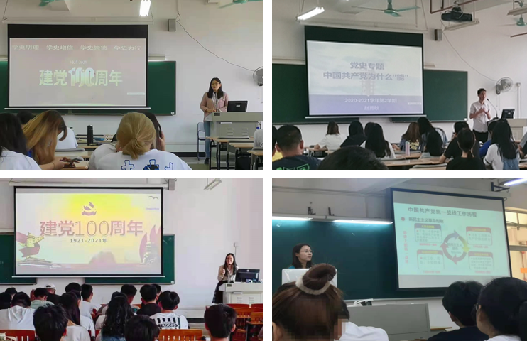 在马院直属党支部的统一安排下,各任课老师以教研室(党小组)为单位进行了集体备课,将党史教育分别融入到《思想道德修养与法律基础》、《毛泽东思想和中国特色社会主义理论体系概论》、《马克思主义中国化进程与青年使命担当》等课程,做到了全体马院教师和任课班级的全覆盖,宣讲内容有《百年风雨兼程 百年沧桑巨变—-百年党史:共产党人砥砺前行的动力与丰富生动的教科书》、《红船精神:开天辟地》、《毛泽东诗词中的党史》、《从万里长征到星辰大海》、《新中国70年奋斗与辉煌》、《改革开放:中国共产党的一次伟大觉醒》、《中国共产党领导脱贫攻坚的经验与启示》、《新时代中国共产党人的历史使命》、《观百年党史 悟初心使命》等,精彩纷呈,生动再现了中国共产党披荆斩棘、砥砺前行的百年风雨奋斗历程。