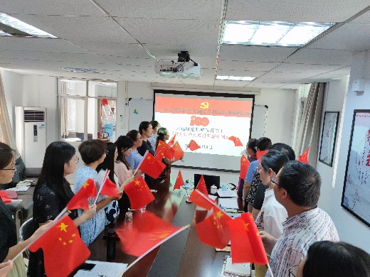 最后,马院全体党员教师在书记李瑞清的带领下,共同唱响《没有共产党就没有新中国》,振奋的旋律在会议室飘荡,饱含深情的歌声唱出对党的无限热爱。这首红遍大江南北、耳熟能详、广为传唱的红色经典歌曲,将本次活动的气氛推向高潮。