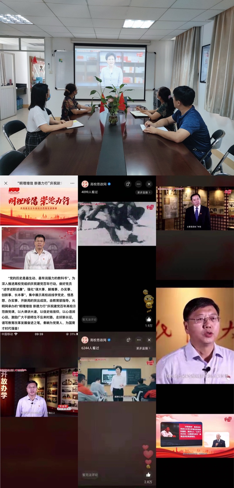 2021年 6月18日上午,由教育部思想政治工作司指导的“明理增信 崇德力行”庆祝建党百年高校示范微党课展播活动第2讲,通过多平台同步播出。马克思主义学院直属党支部组织全体教师观看。马院行政人员于6月18日上午在马院办公室收看学习该党课直播,并安排早上没有课程安排的教师们根据教育部思想政治工作司提供的链接进入观看学习。