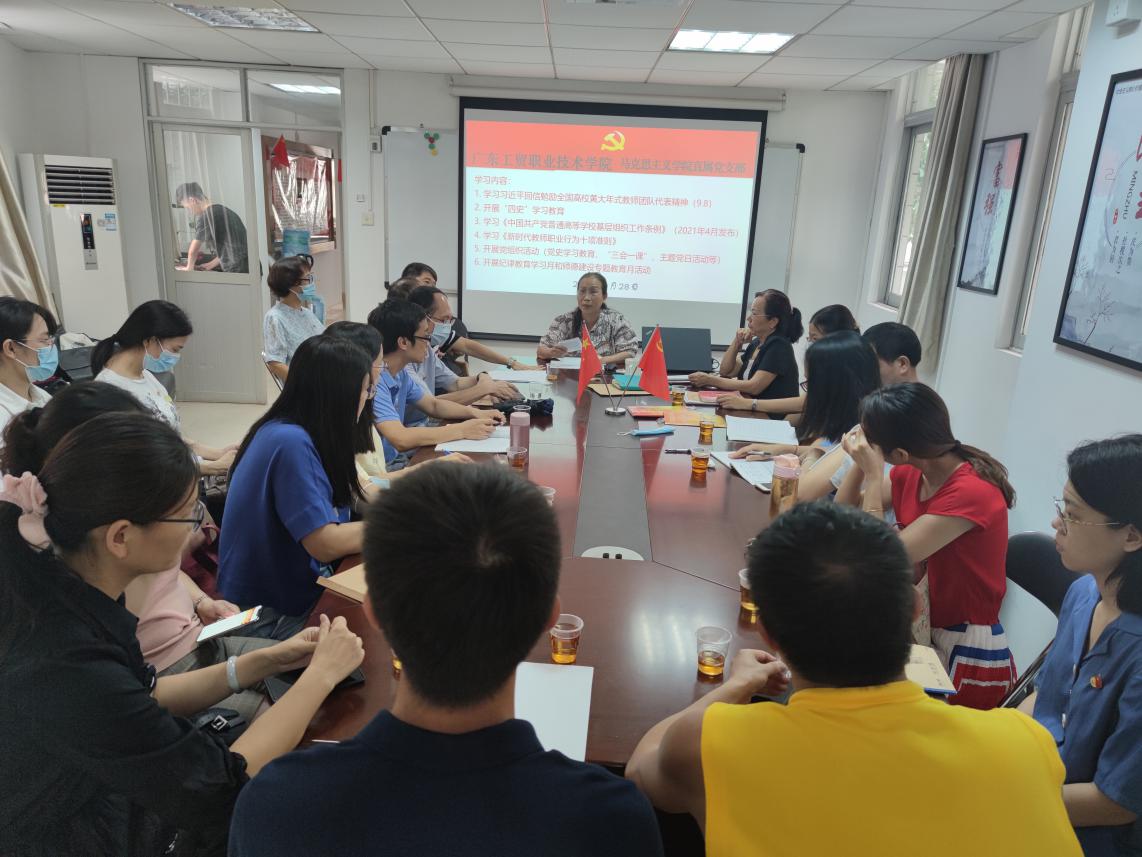 随后,全体教师一起学习《中国共产党普通高等学校基层组织工作条例》(2021 年 4 月发布) 以及《新时代教师职业行为十项准则》。《条例》指出高校党组织应当把理想信念教育放在首位。把培育和践行社会主义核心价值观融入大学生思想政治教育工作和师德师风建设的全过程,帮助广大师生树立正确的三观,坚定中国特色社会主义道路自信、理论自信、制度自信、文化自信。作为马克思主义学院教师要按照新时代教师职业行为要求,自觉做到以德立身、言传身教。