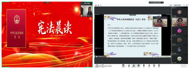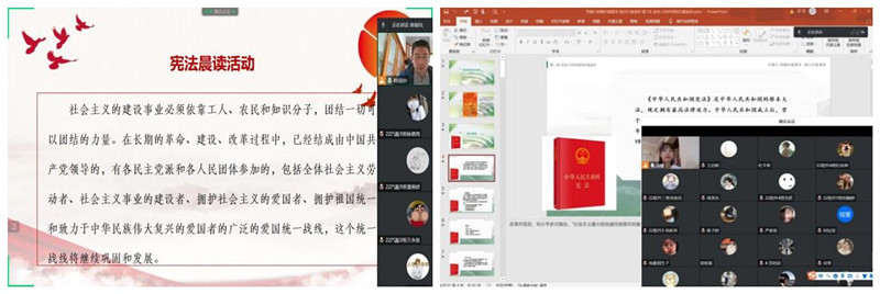一是与团委、学生处一起组织全体在校生完成广东省教育厅“宪法卫士”网络答题活动,完成率90%以上。二是制定发布了《马克思主义学院关于举办“国家宪法日”系列宣传活动方案》,在全体大一新生中通过思想道德与法治课程主渠道,由任课教师组织学生开展“宪法晨读”和“国家宪法日“网络答题活动。在国家宪法日晨读活动中,由思想道德与法治课教师带领全体学生在课堂上朗读《中华人民共和国宪法》。