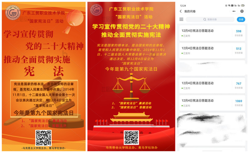 今年12月4日是第9个国家宪法日,为深入学习贯彻党的二十大精神中“坚持全面依法治国,推进法治中国建设”目标,认真学习宣传习近平法治思想,推动广大师生尊崇宪法、学习宪法、维护宪法、运用宪法,马克思主义学院开展了“国家宪法日”系列宣传活动。