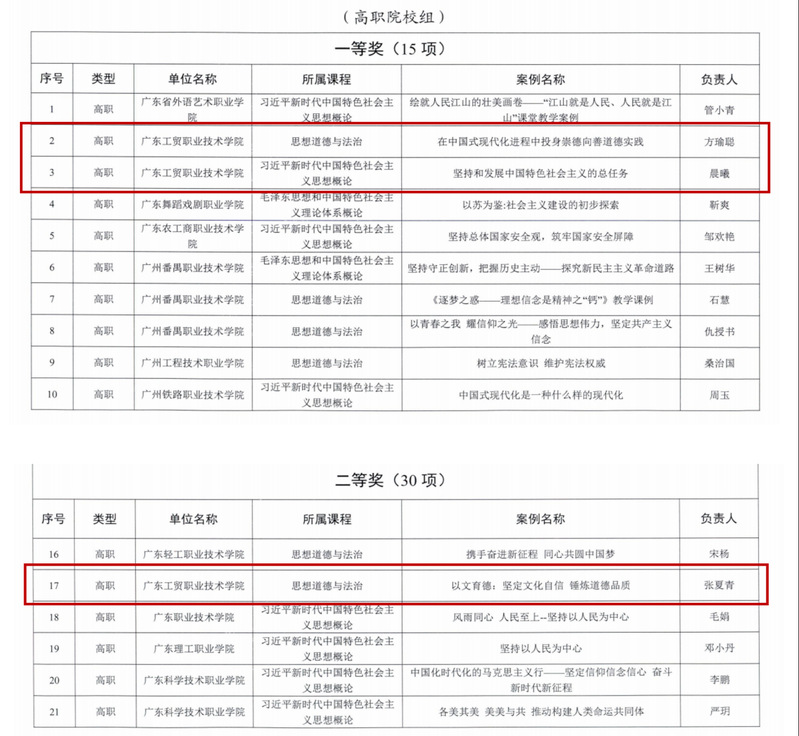 近日,广东省教育厅公布了《党的二十大精神融入高校思政课优质课例征集活动》评选结果。经个人(团队)申报、学校推荐、综合评审,共评出本科院校组一等奖12项、二等奖24 项、三等奖35项,高职院校组一等奖15项、二等奖30项、三等奖 46项。其中,我校马克思主义学院方瑜聪老师的课例《在中国式现代化进程中投身崇德向善道德实践》与晨曦老师的课例《坚持和发展中国特色社会主义的总任务》荣获高职院校组一等奖,张夏青老师的课例《以文育德:坚定文化自信 锤炼道德品质》荣获高职院校组二等奖。