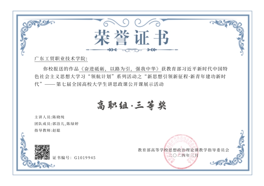 近日,由教育部社会科学司指导、教育部高校思政课教学指导委员会主办的“新思想引领新征程·新青年建功新时代”第七届全国大学生讲思政课公开课展示活动获奖名单公布。我校学生参赛作品《奋进砥砺·以路为引·强我中华》在全国评选中脱颖而出,荣获全国高职组三等奖。