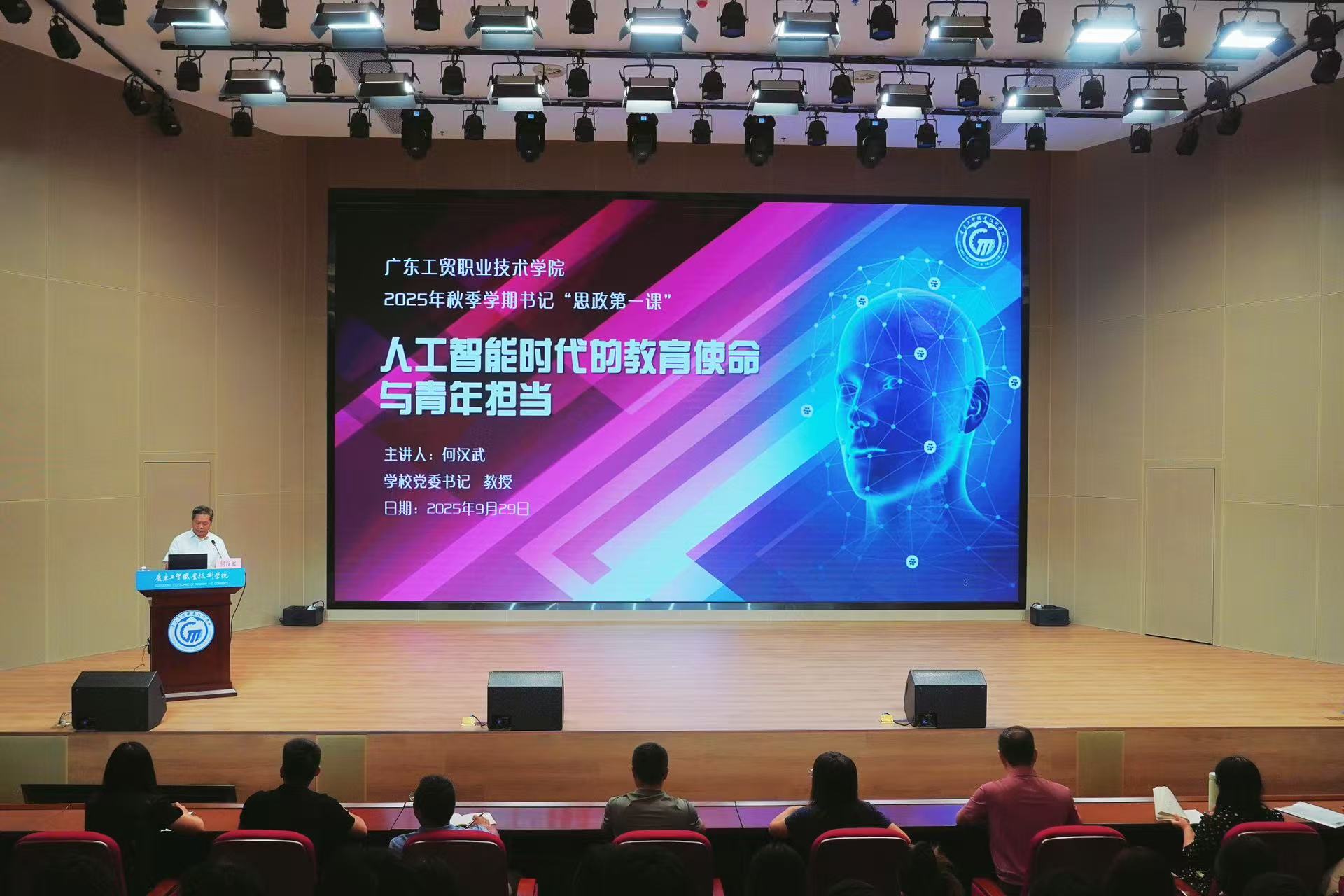 为深入贯彻习近平总书记关于思政课建设的重要指示批示精神,强化学校党政领导抓思政课建设的主体责任,根据《广东省教育厅关于做好2025年秋季学期大中小学校党组织书记、校长上第一堂思政课工作的通知》要求,学校党委书记何汉武教授以“人工智能时代的教育使命与青年担当”为题,于2025年9月29日和10月9日,分别在白云校区博学楼报告厅、天河校区西区学术报告厅为师生讲授了2025-2026学年秋季学期“思政第一课”暨工贸大讲堂第3期。马克思主义学院教师、学工干部、辅导员及学生代表共近800人聆听讲座。课程围绕国家战略、实践路径与治理体系,深入阐释人工智能时代职业教育的使命与青年责任。