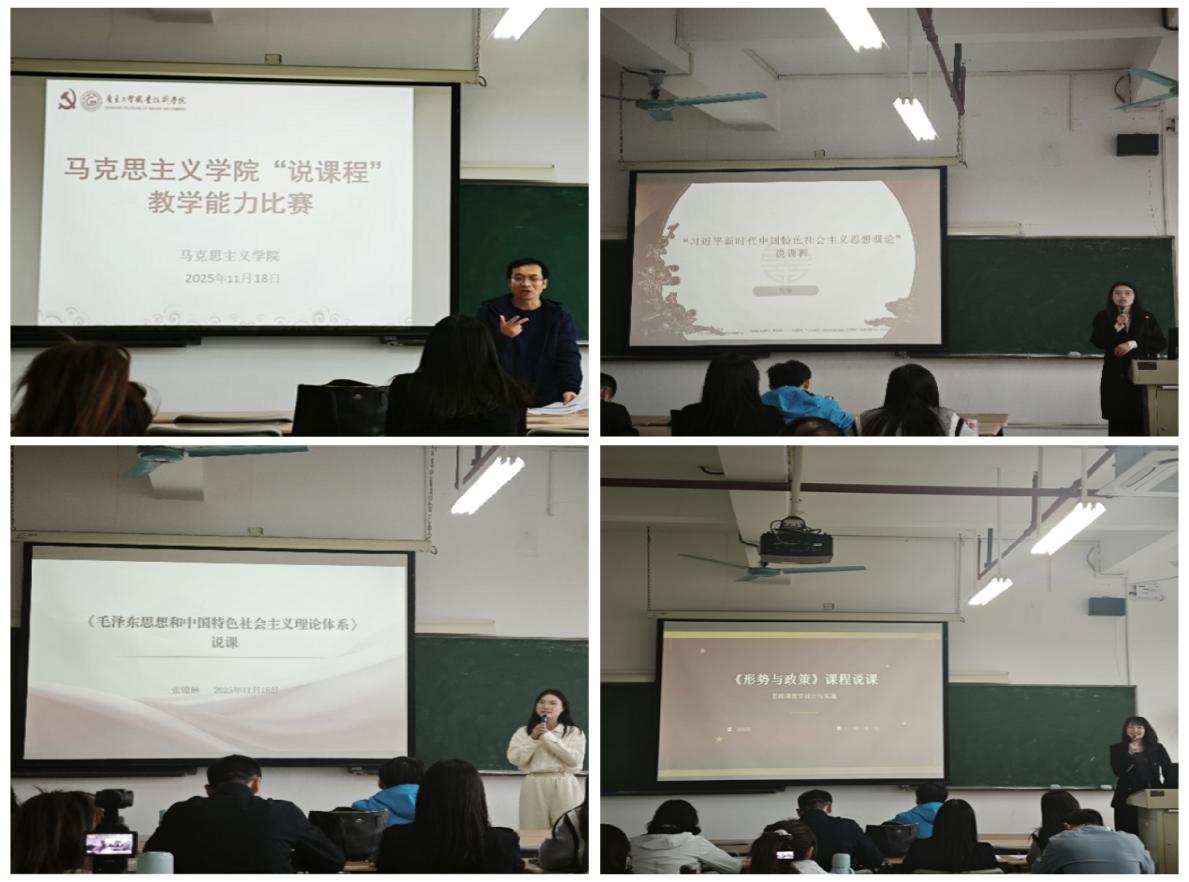 为推进课程改革,加强教师之间的相互交流与学习,提高教师课程建设、教育教学等综合能力。根据我校《关于开展2025年“说专业群、说专业、说课程”比赛活动的通知》,马克思主义学院于2025年11月18日举办了院级选拔赛,学院全体教师齐聚现场观摩学习。