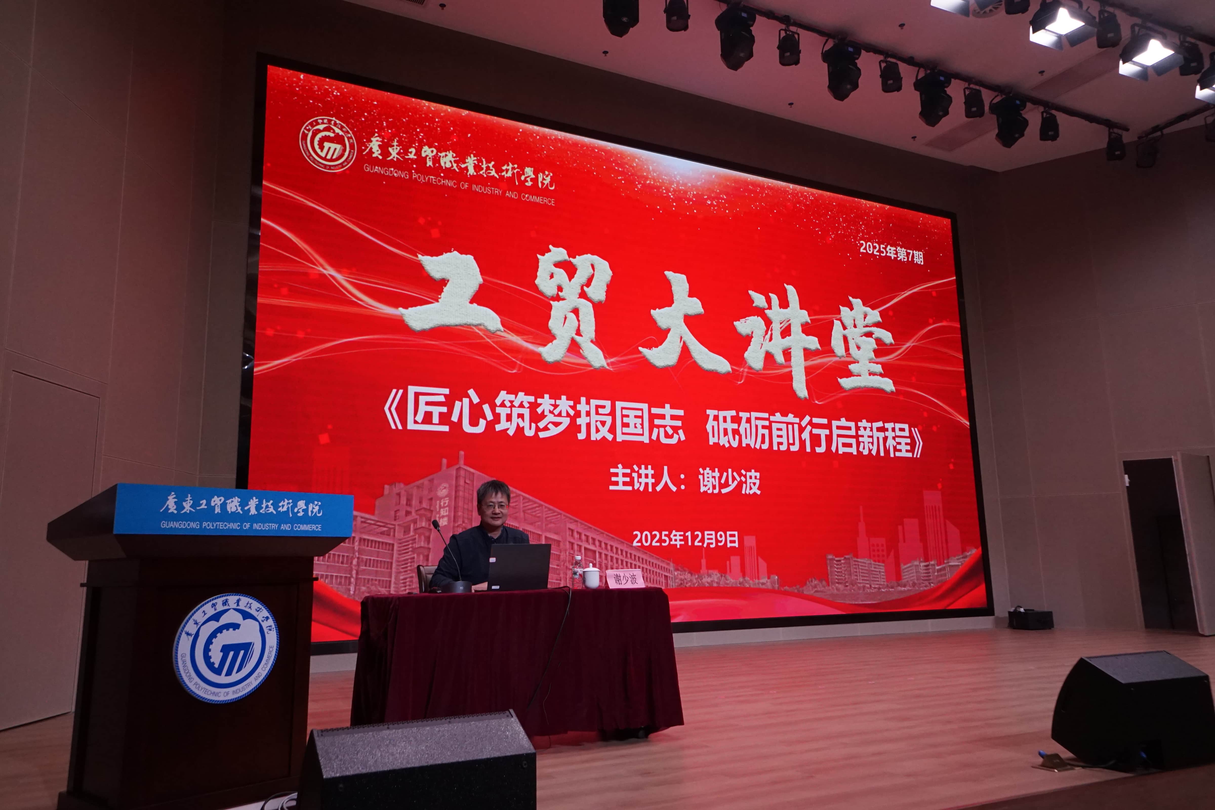为深入贯彻落实立德树人根本任务,为深化思政教育实践,引领我校学子弘扬劳模精神,以榜样力量引领青年学子坚定理想信念、砥砺奋斗品格,激发技能报国的热情,助力学校双高院校建设,2025年12月9日下午,太阳集团城官网1407在白云校区博学楼一楼学术报告厅成功举办2025年第7期“工贸大讲堂”暨劳模进校园活动。本期讲堂特邀全国劳动模范、全国五一劳动奖章获得者谢少波以“匠心筑梦报国志,砥砺前行启新篇”为主题,为师生带来一场沉浸式的精神洗礼与奋斗启迪。活动由马克思主义学院、学生工作部、关心下一代工作委员会和教学质量监测与评估中心共同组织,学校党委书记何汉武、马克思主义学院院长刘凤梅、学生工作部副部长郭朝明和近500名师生代表参加了活动。