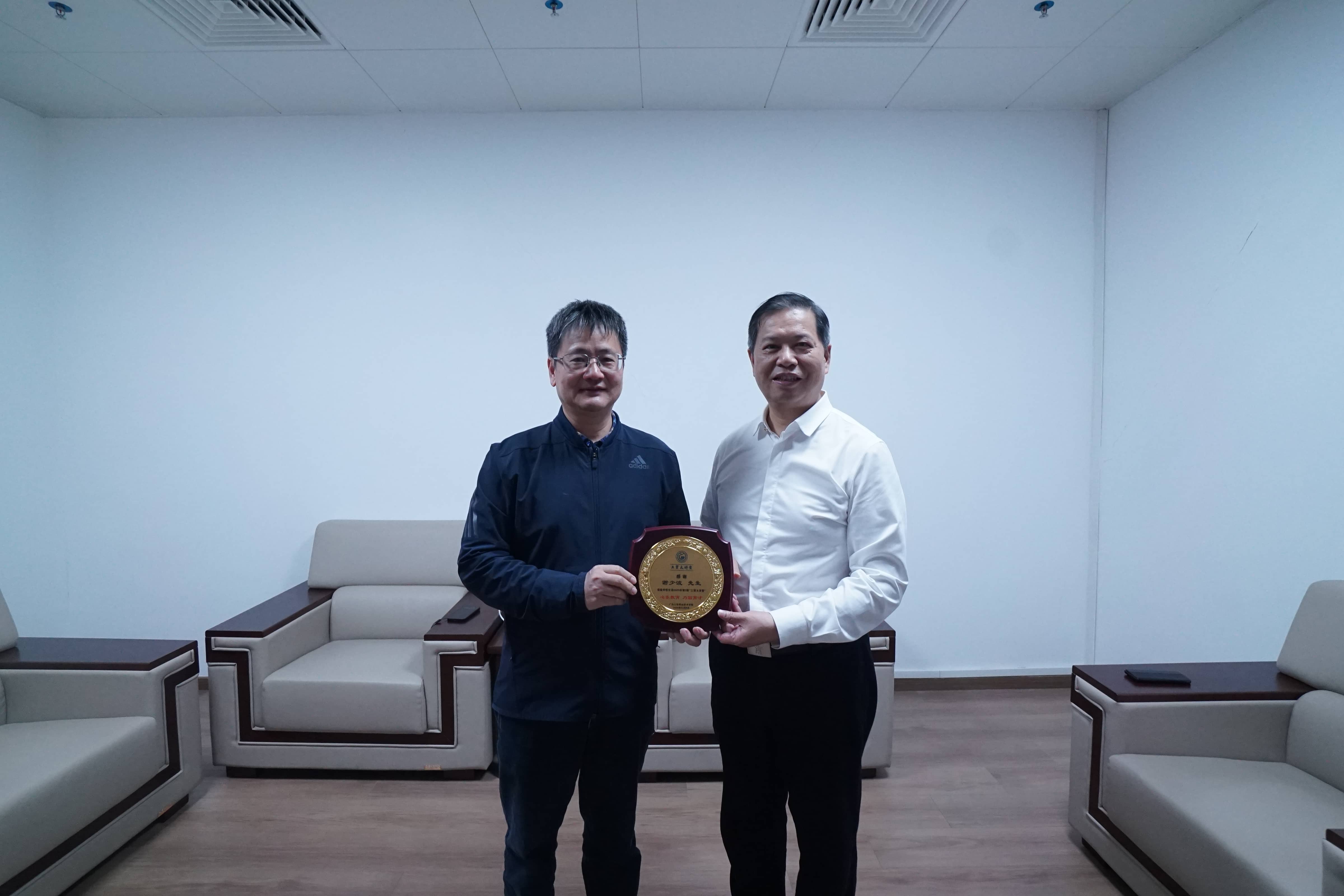 在讲座开讲前,何汉武与谢少波亲切座谈,代表学校向谢少波赠送“工贸大讲堂”纪念牌,并颁发了聘书。