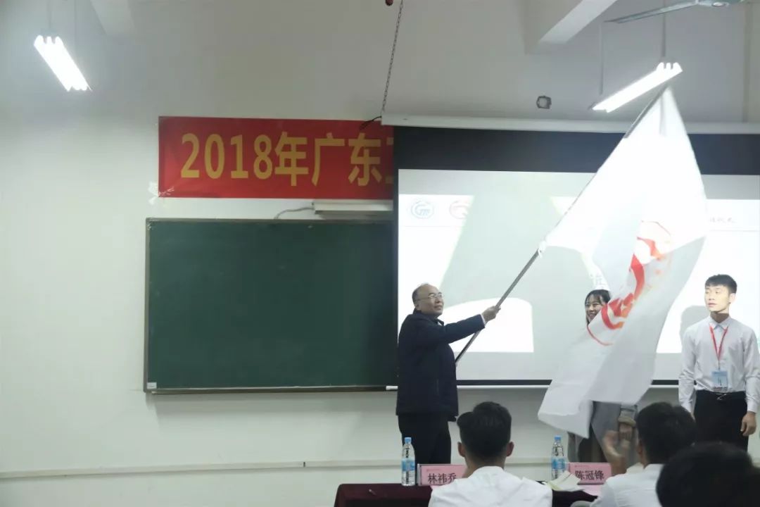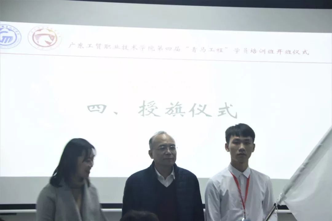 最后,进入大会的第四项议程:授旗仪式。有请青马骨干班班主任林祎乔老师、学生代表戴泽威同学上台,由学校党委副书记、纪委书记夏韩辉同志上台为他们授旗。
