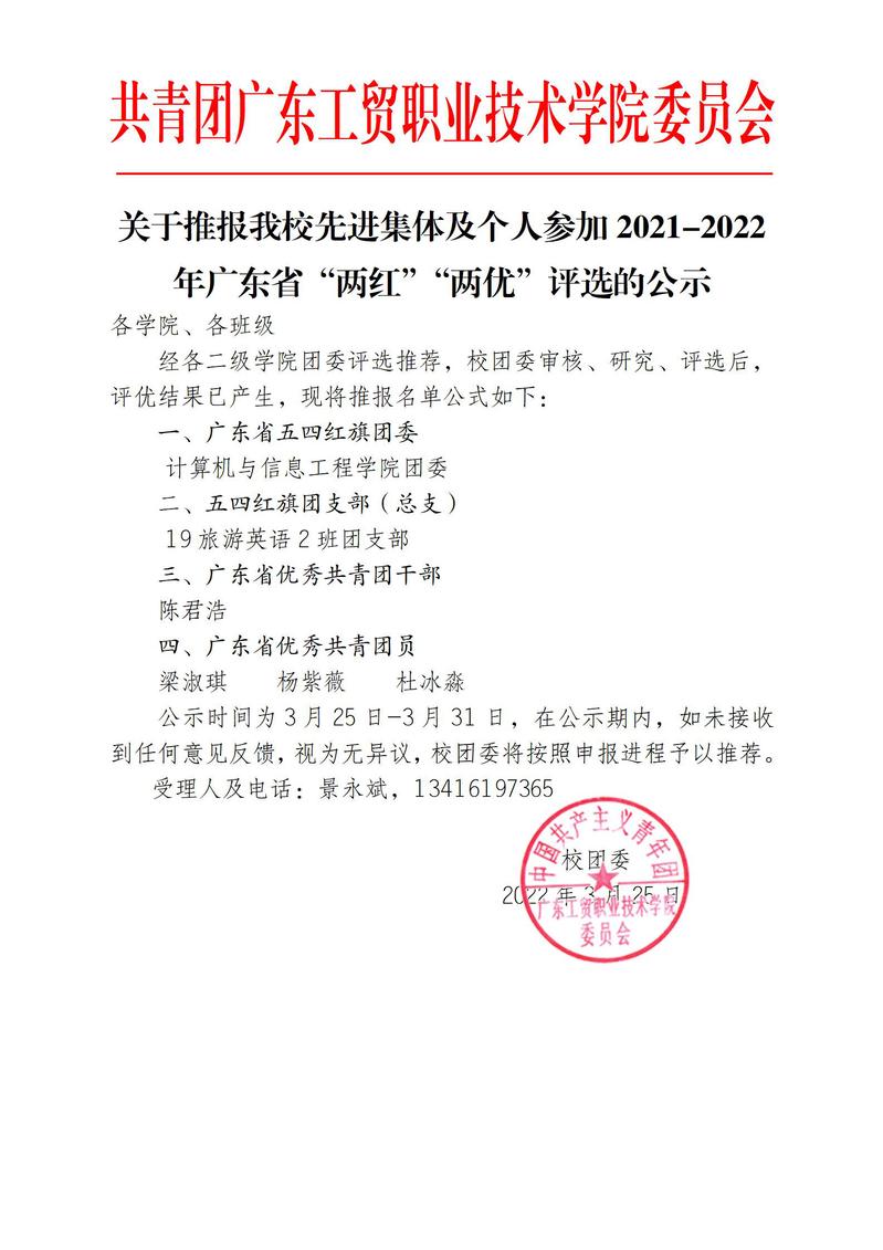 关于推报我校先进集体及个人参加2021-2022年广东省“两红”“两优”评选的公示