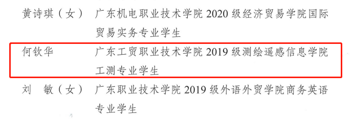 测绘遥感信息学院19工程测量专业学生何钦发荣获“广东省优秀学生骨干”称号