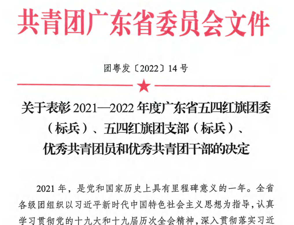 在建团100年之际,我校共青团工作传来喜讯。近日,根据团省委公布的《关于表彰2021-2022年度广东省五四红旗团委(标兵)、五四红旗团支部(标兵)、优秀共青团员和优秀共青团干部的决定》(团粤发【2022】14号),学校应用外语学院19旅游英语专业2班团支部荣获“广东省五四红旗团支部”称号,测绘遥感信息学院团委书记陈君浩荣获“广东省优秀团干部”,经济贸易学院2019级市场营销专业梁淑琪、测绘遥感信息学院2019级房地产检测与估价专业杨紫薇、汽车工程学院2019级电子信息工程技术杜冰淼等3名学生荣获“广东省优秀共青团员”称号。