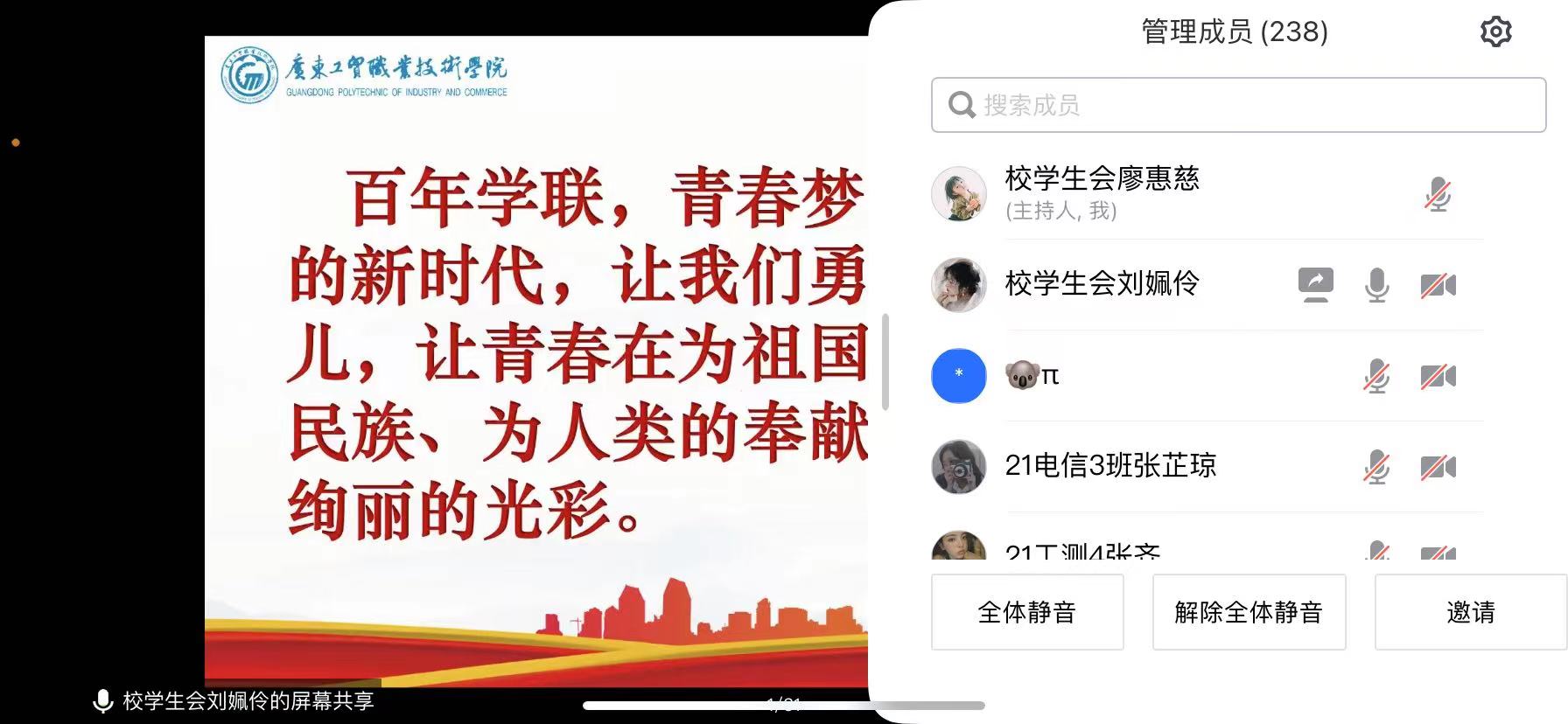 为深入了解学习习近平总书记在庆祝中国共产党成立100周年大会上以及庆祝中国共产主义青年团成立100周年的讲话,进一步贯彻落实从严治会、提高学生干部的思想政治教育、发挥学生干部的积极带头作用、加强学生干部的凝聚力。我校于2022年10月6日下午14:00在腾讯会议上邀请校院两级学生会组织工作人员开展了第一次学生会干部培训会议。