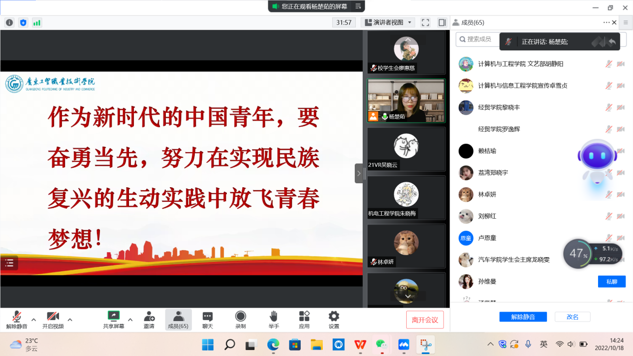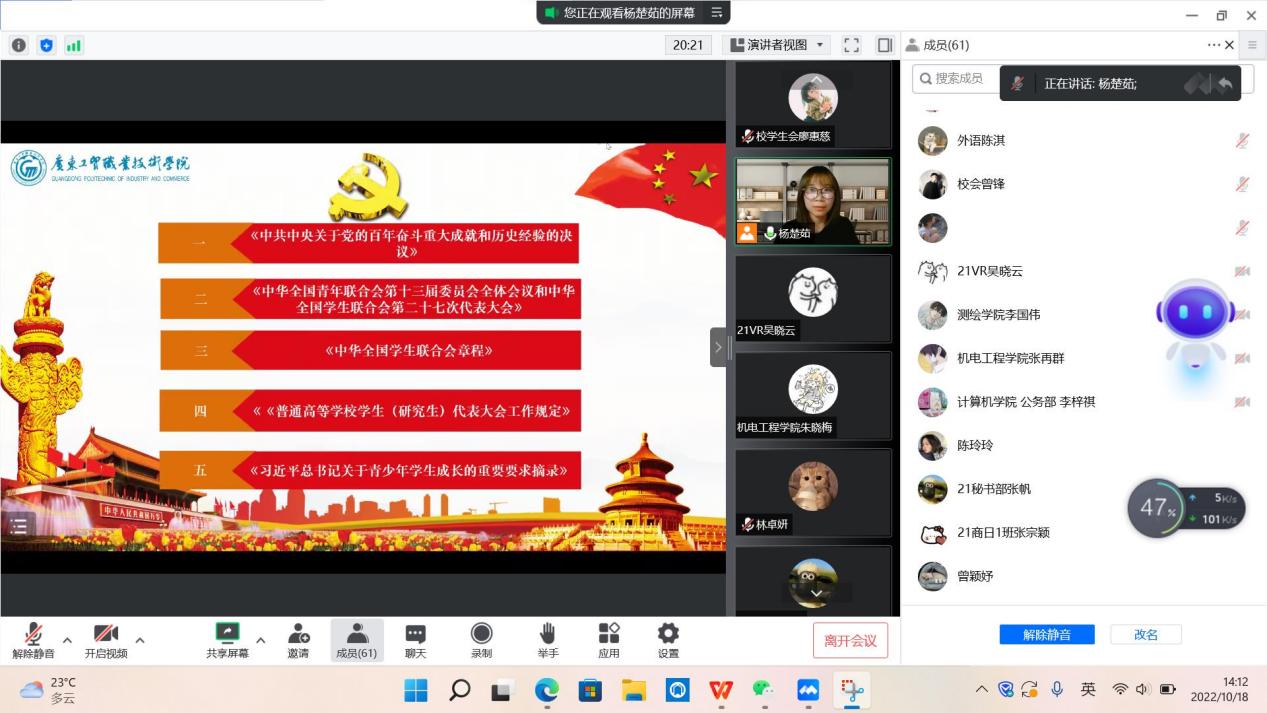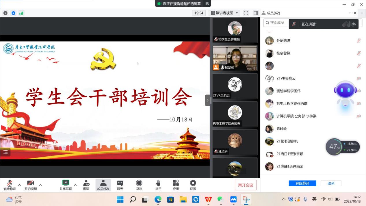总结党的百年奋斗重大成就和历史经验,是在建党百年历史条件下开启全面建设社会主义现代化国家新征程、在新时代坚持和发展中国特色社会主义的需要;是增强政治意识、大局意识、核心意识、看齐意识,坚定道路自信、理论自信、制度自信、文化自信,做到坚决维护习近平同志党中央的核心、全党的核心地位,坚决维护党中央权威和集中统一领导,确保全党步调一致向前进的需要;是推进党的自我革命、提高全党斗争本领和应对风险挑战能力、永葆党的生机活力、团结带领全国各族人民为实现中华民族伟大复兴的中国梦而继续奋斗的需要。全党要坚持唯物史观和正确党史观,从党的百年奋斗中看清楚过去我们为什么能够成功、弄明白未来我们怎样才能继续成功,从而更加坚定、更加自觉地践行初心使命,在新时代更好坚持和发展中国特色社会主义。我校于2022年10月18日14:00在腾讯会议组织校院两级学生会组织工作人员开展了学生会干部培训会议。