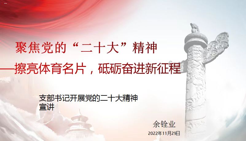 余铨业主任作为体艺部直属党支部临时负责人,于2022年11月29日下午14:00,以“擦亮体育名片,砥砺奋进新征程”为主题对本支部党员及部门全体教职工进行宣讲,相关内容如下: