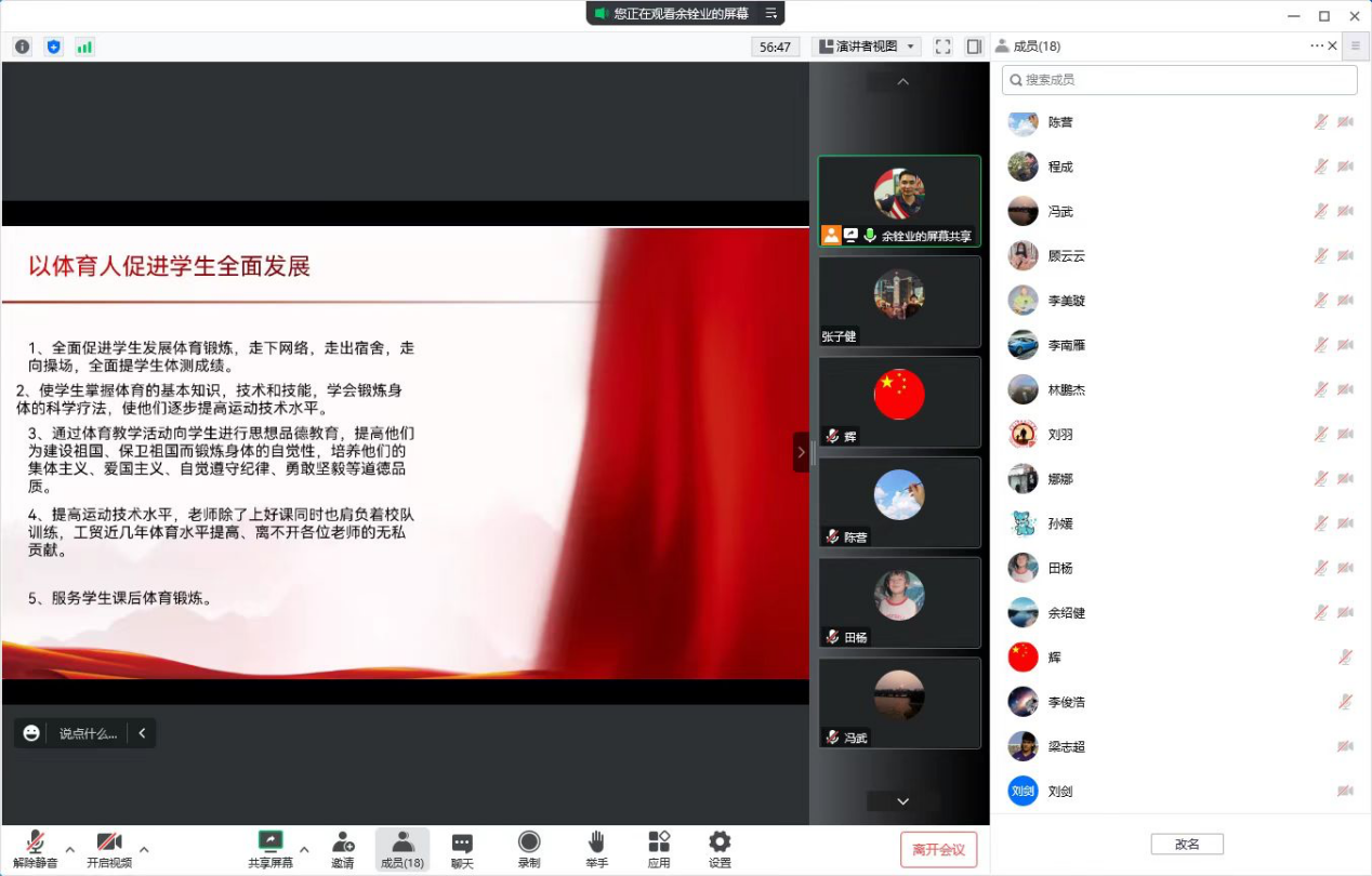 2、深化新时代体育改革,坚持立德树人的指导思想。余主任结合近期系统推进学校体育评价改革,强调课后评价及课堂教学主阵地作用,也提出部门近年来积极开展各项体育活动,并坚持健康第一的教育理念,加强体育师资队伍的建设,同时介绍学校体育场馆设施建设和学生健康相关工作。