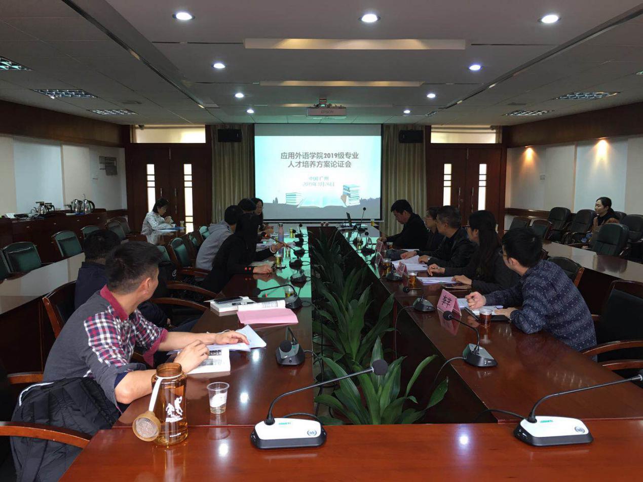 326上午应用外语学院邀请广州工程职技术职业学院外语与商贸系主任张云勤、广州铁路职业技术学院外语商贸学院院长王友良、广东技术师范大学日语系主任李芊、广州保利假日酒店人力资源经理熊锦、深圳头狼电子商务有限公司董事长朱加宝等专家在天河校区第一会议室举行2019专业人才培养方案论证会。学院院长彭枚芳、党总支书记李德富、党总支副书记罗春科、副院长杨国民、邓国栋以及各教研室主任与专业带头人等参加了论证会。论证会由彭枚芳院长主持。
