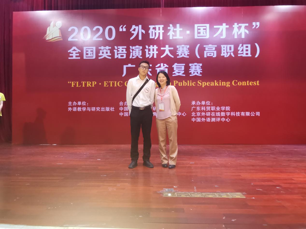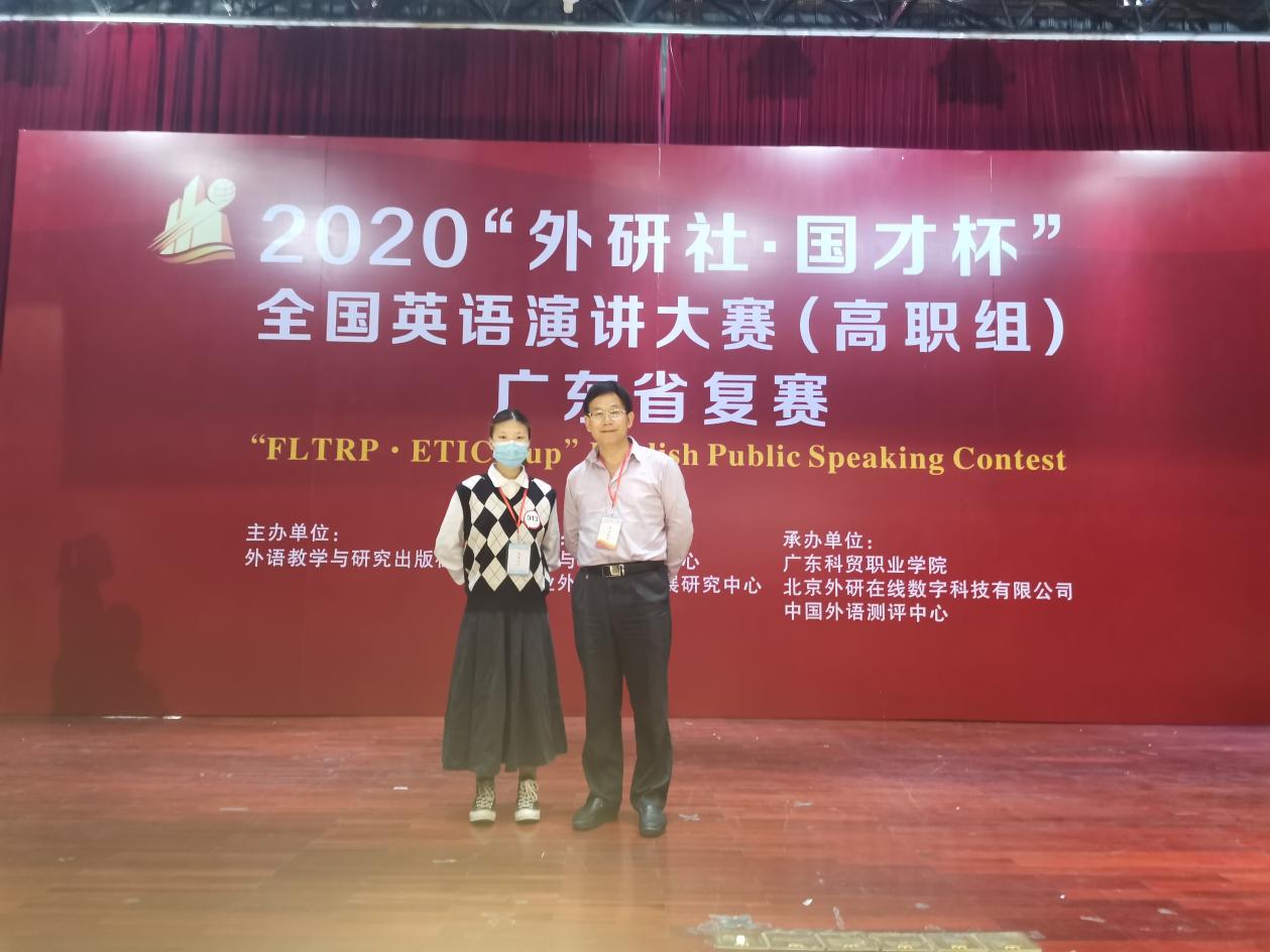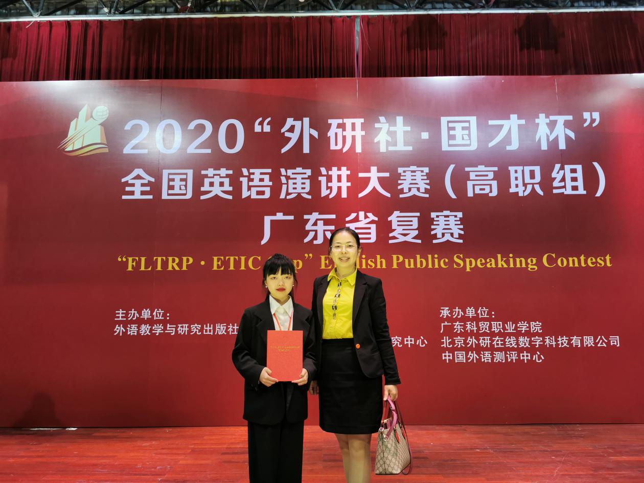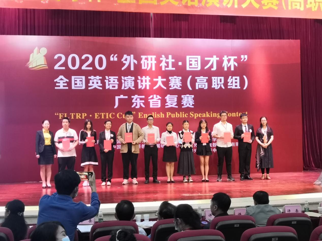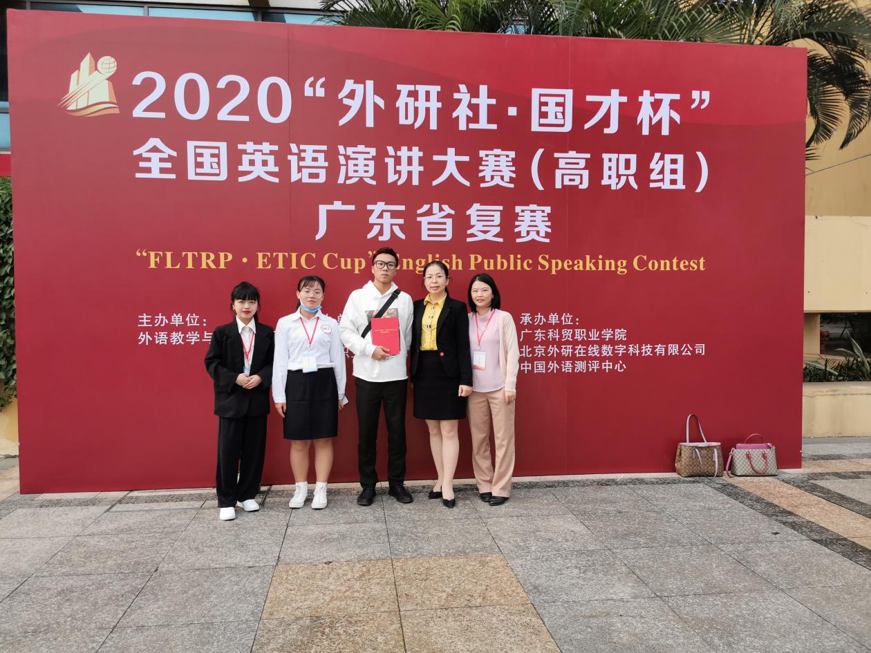 11月15日,2020“外研社·国才杯”全国英语演讲大赛(高职组)广东省复赛在广东科贸职业学院举办。全省共有40多所高职院校70位选手参加了此次比赛,比赛规模盛大。应用外语学院20商英2班傅欣然在彭枚芳老师的指导下获省级二等奖,19旅英3班梁沛轩,19旅英1班曾炜懿,19商英1班梁卓玲在聂雪芬、曾昭涛、曾岸华老师的指导下获省级三等奖,四位选手在此次比赛均中取得优异成绩。