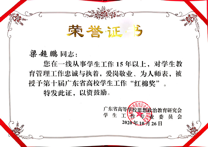 机电工程学院党总支副书记总梁超鹏获第十届广东省高校学生工作“红棉奖”