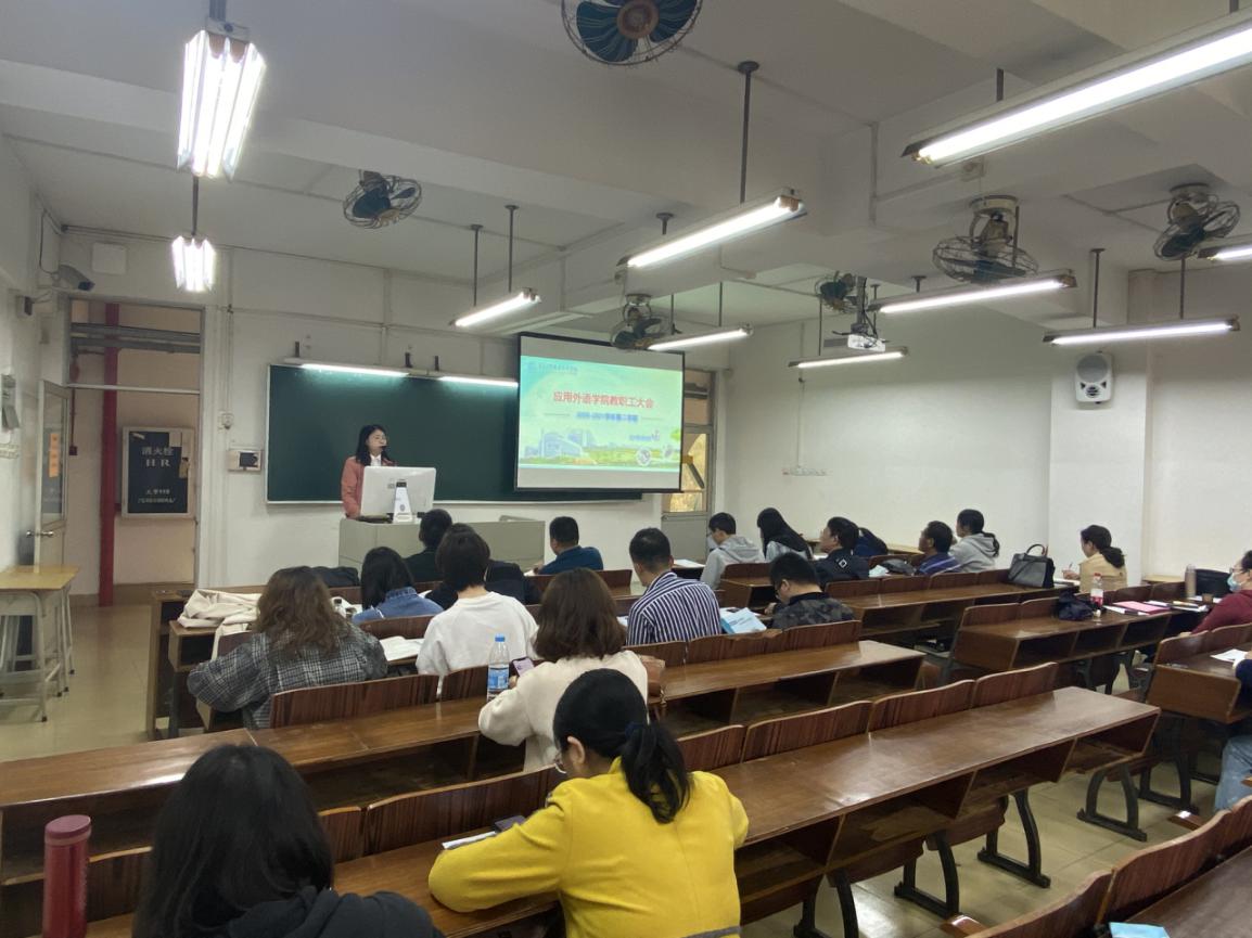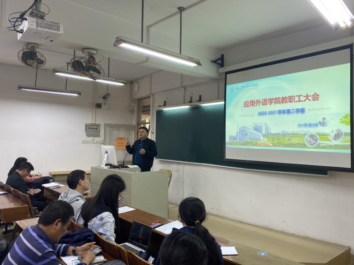 2月28日下午,应用外语学院在天河校区西区406召开全院教职工大会,学院领导与全体教职工立足新起点,展望新学期。学院党总支书记李德富、院长彭枚芳、党总支副书记罗春科、副院长杨国民、邓国栋以及全体教职工参加了本次会议。