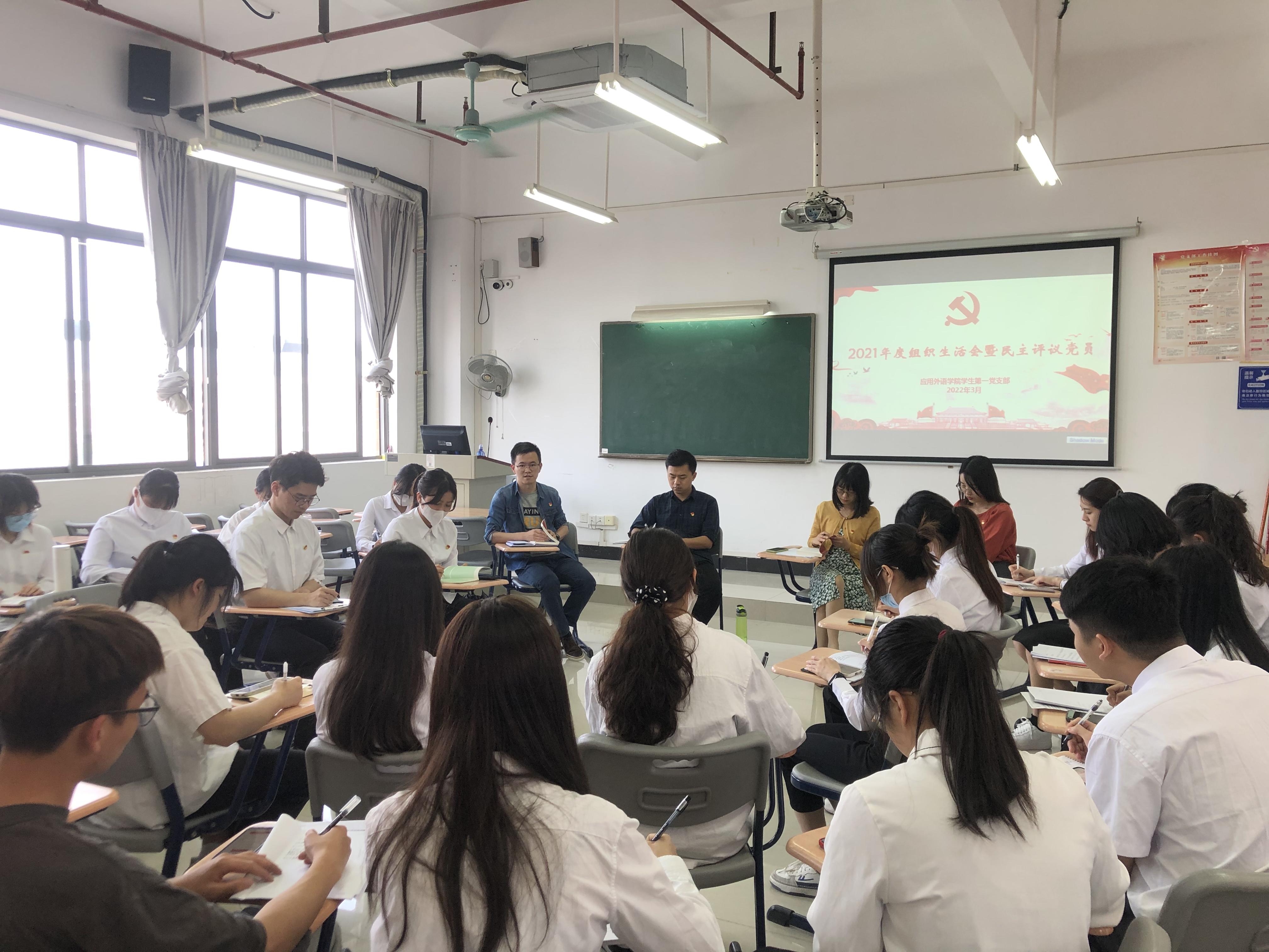 为深入学习贯彻党的十九届六中全会精神,不断推进党的建设新的伟大工程,根据学校党委有关工作部署要求,应用外语学院学生第一党支部于3月15日下午2点在明德楼1-618党员活动室召开了2021年度组织生活会暨民主评议党员会议,支部全体党员参加了本次会议,会议由支部书记陈晓玲主持。