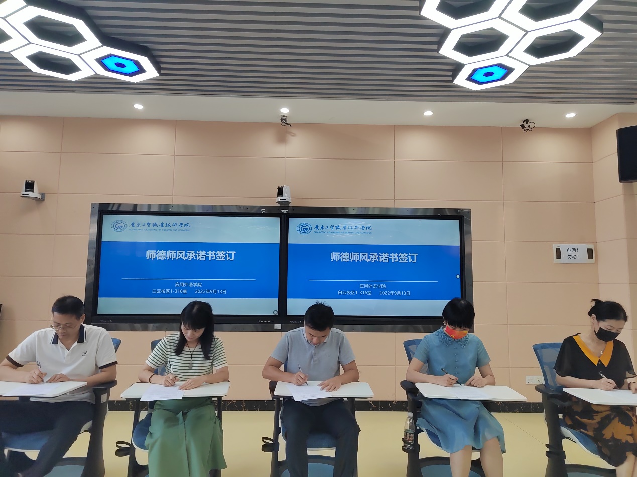 会后,外语学院领导班子与学院全体教师签署了太阳集团城官网1407师德师风承诺书,向社会和学校做出郑重的承诺:不断提高师德修养,自觉守护三尺讲台,争做新时代“四有”好老师。