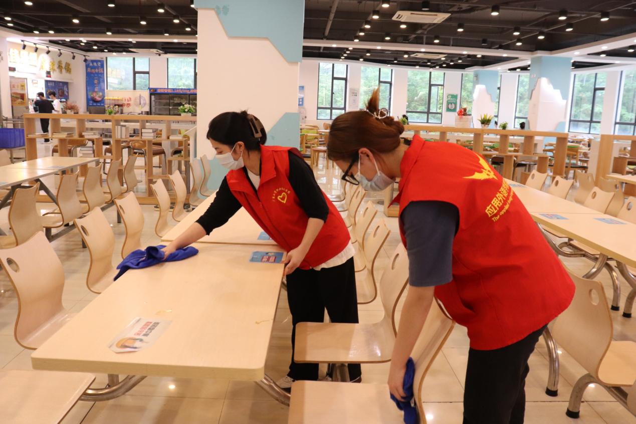 下午三点,负责人们带领志愿者们来到兰苑、桂苑两个饭堂进行清扫。首先,负责人们发放抹布、扫把等工具,并分配任务。紧接着,志愿者们积极有序地投入到各自的任务中,将餐桌椅上残留的垃圾清理干净,窗户擦地一尘不染。最后,志愿者们齐心协力地将饭堂清扫完。