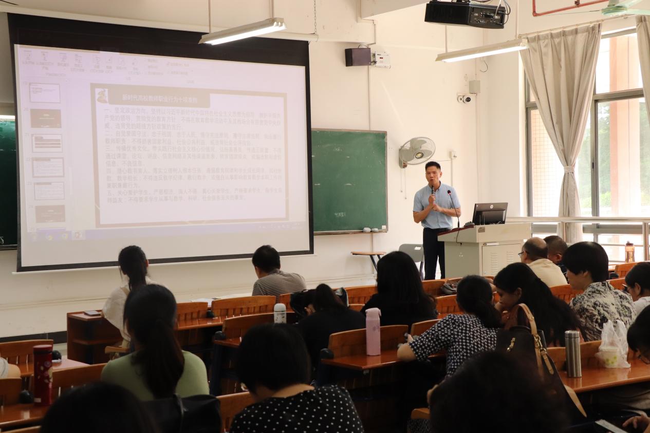 罗春科领学二十届中共中央政治局第五次集体学习会议精神。他指出,全体教职工要坚持党对教育事业的全面领导为根本保证,在高远使命引领下,深入学习贯彻习近平新时代中国特色社会主义思想,牢牢把握学院工作正确方向。同时,全体教师要做好主题教育“后半篇文章”,让主题教育成果更好地指导工作、解决问题、推动发展、推动学院高质量党建引领。随后,他对师德建设主题教育月内容作详细解读,依据《教育部办公厅关于进一步规范高等学校师生关系有关行为通知》、《中华人民共和国教师法》等有关规定,强调了师德师风建设的重要性,并结合具体事例解读了《新时代高校教师职业行为十项准则》,希望教职工规范言行,明确底线红线,做教书育人的“大先生”。