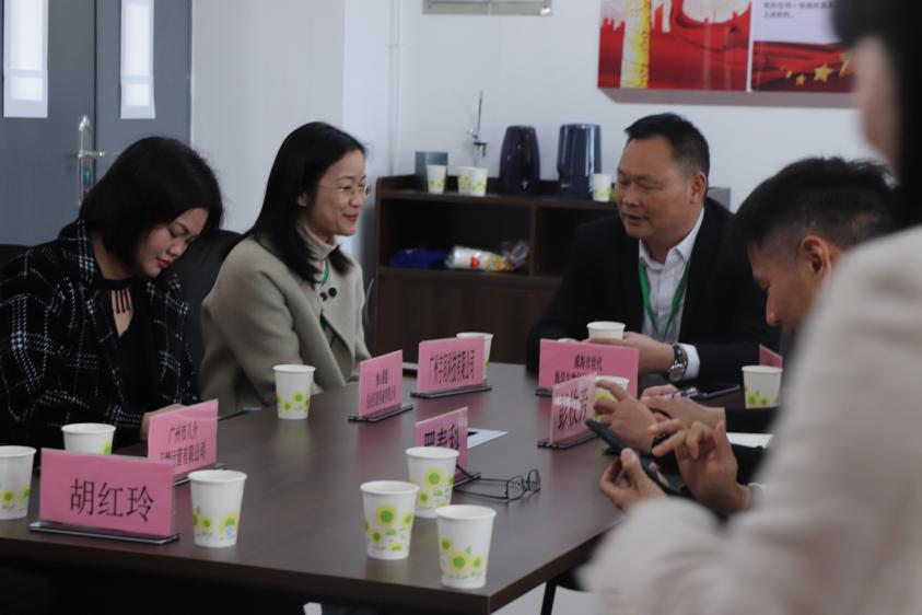 本次访企拓岗交流座谈会邀请了深圳中洲圣庭苑酒店有限公司、广州字间科技有限公司、山东威海世代海洋生物科技有限公司、佛山银盘信业信息咨询有限公司、广州市八介品牌运营有限公司等5家公司代表出席本次会议。彭枚芳对参会企业代表表示热烈欢迎并与企业代表亲切面谈,现场气氛轻松愉悦。