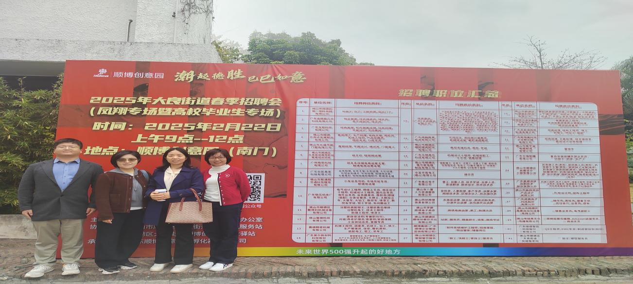 为给毕业生提供高质量就业渠道,促进毕业生积极就业,2025年2月22日,经应用外语学院牵头组织策划,由应用外语学院王宗喆、雷莹、黄清霞、叶夏四位教师带领应用外语学院、经济贸易学院、机电工程学院毕业班学生参加大良公服办和顺博创意园就业驿站联合举办的2025年大良街道春季招聘会(凤翔专场暨高校毕业生专场)。