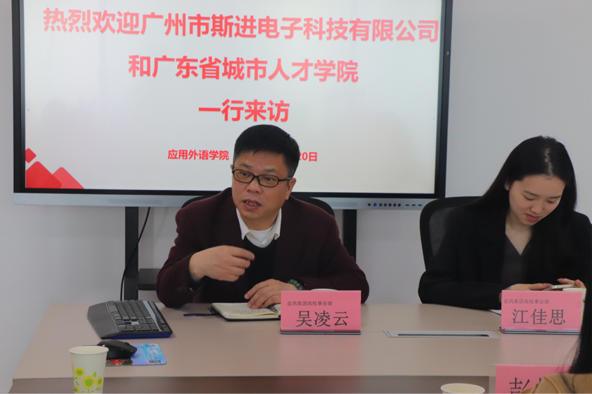 320日上午,太阳集团城官网1407应用外语学院与广州市斯进电子科技有限公司、广东省城市人才学院校企合作签约仪式在实训楼611举行。院长彭枚芳与企业代表围绕人工智能、外语职业教育、社会培训、就业创业等领域深度探讨合作路径,并签署校企框架合作协议。双方计划通过教学点共建、创业孵化、定制化人才培养等创新产教融合新模式。