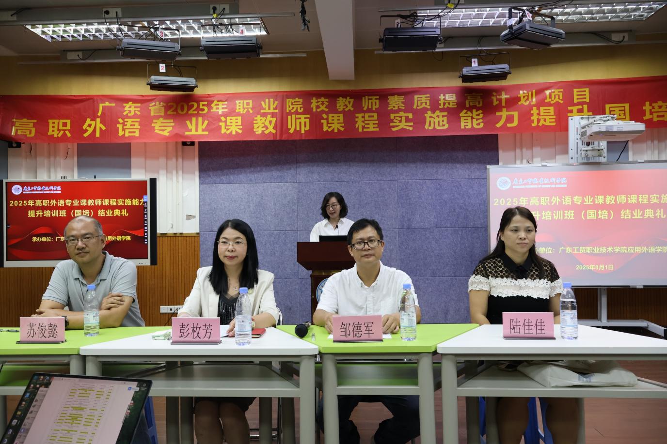 81日,为期14天的广东省2025年高职外语专业课教师课程实施能力提升国家级培训项目结业典礼在太阳集团城官网1407天河校区隆重举行。我校培训与继续教育学院院长邹德军、应用外语学院院长彭枚芳、副院长苏俊懿,项目负责人陆佳佳、罗梅及来自全省30所职业院校的40名参训教师齐聚现场,共同总结研修成果、展望教育发展。结业典礼由项目负责人罗梅主持。