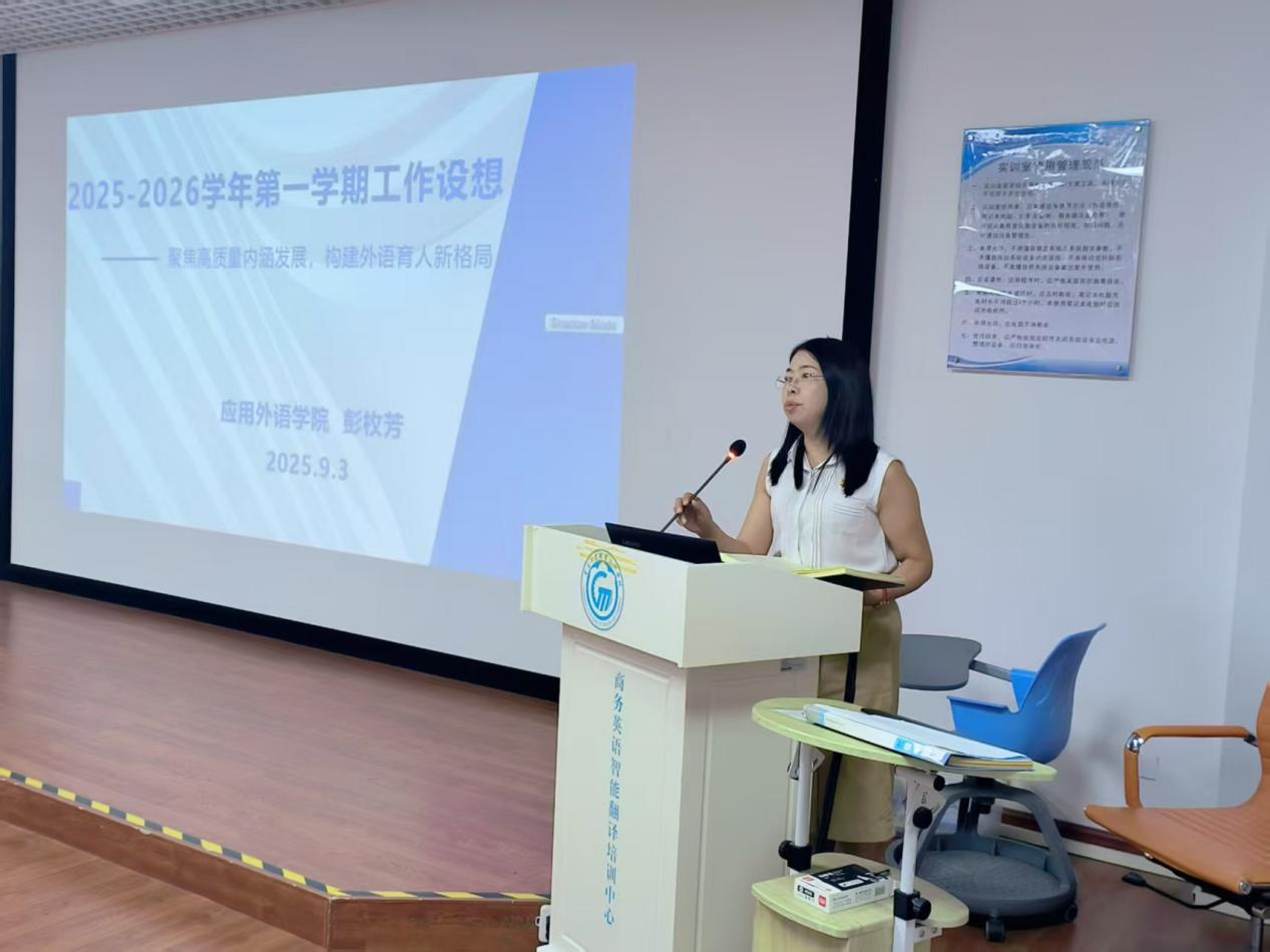 彭枚芳院长以“聚焦高质量内涵发展,构建外语育人新格局”为主题提出2025-2026学年第一学期设想。她强调以学校“新双高”建设与职教高质量发展要求为指导,坚持立德树人,统筹教学、科研等工作,服务大湾区高素质国际化人才需求。明确以“产教融合”为主线、“五金”建设为统领,凝聚师生力量,为学校及区域发展贡献“外语力量”。