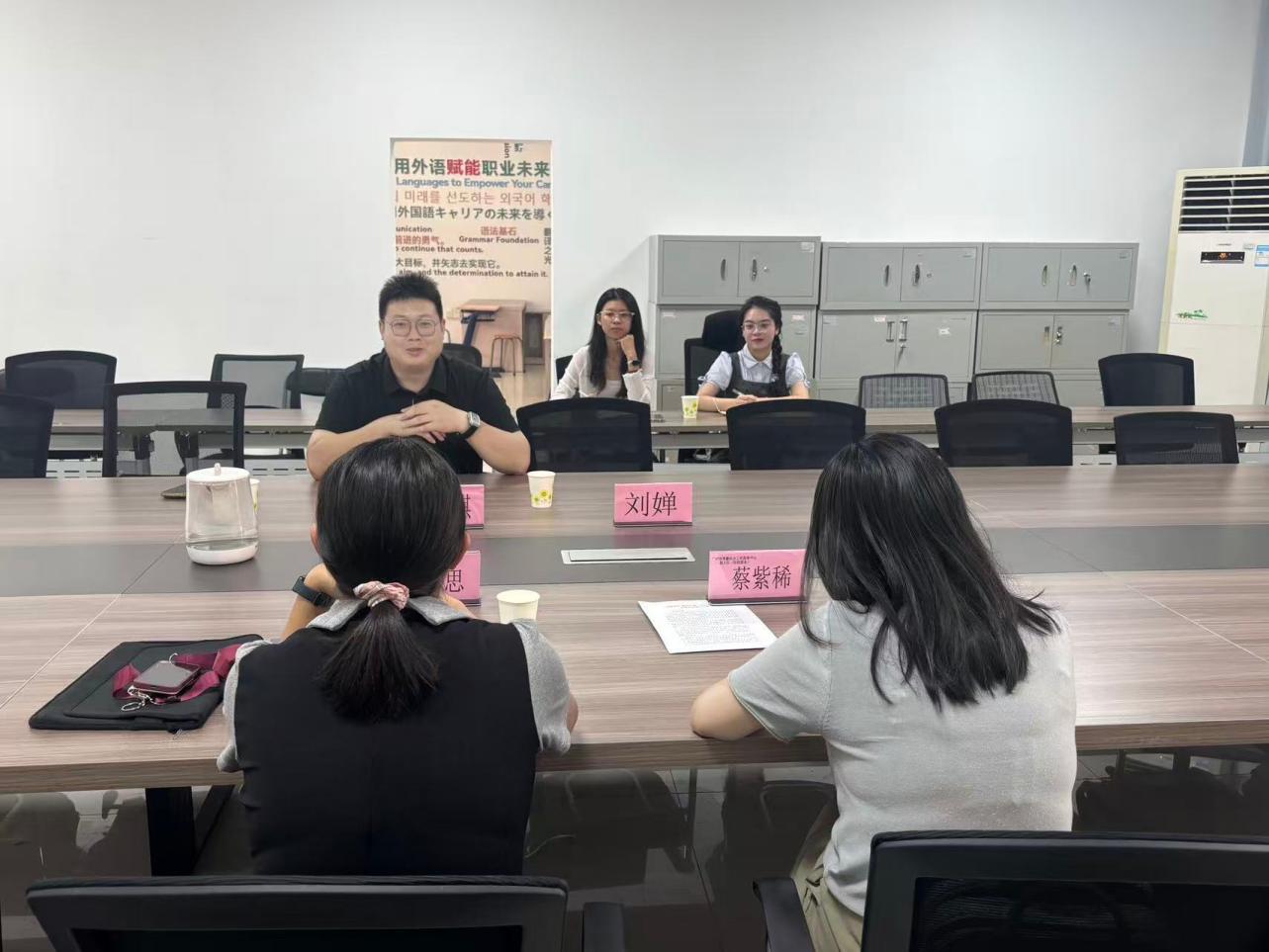 2025年9月16日,广州市青藤社会工作服务中心杨曼思副主任、蔡紫稀副主任与太阳集团城官网1407应用外语学院头雁服务队负责人冯锐骐老师及两位队长,于行知楼606会议室举行会议。