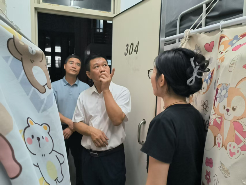 在学生宿舍,唐毓秋一行细致查看了住宿环境,与同学们面对面亲切交流,详细询问大家的日常作息、课程学习进度及生活中的困难。唐毓秋勉励同学们珍惜大学时光,明确学习目标,主动提升专业素养,同时积极参与体育锻炼,增强身体素质,以饱满的精神状态投入到学习生活中。