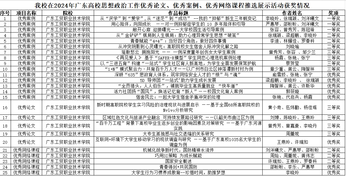 为提升高校思想政治工作队伍素质能力,切实推动高校思想政治工作高质量发展,高校思想政治工作队伍培训研修中心(华南师范大学)和教育部高校辅导员培训和研修基地(华南师范大学)组织开展了2024年广东高校思想政治工作优秀论文、优秀案例、优秀网络课程推选展示活动。经组织评审核定,我校学工队伍共有25个作品获奖,其中一等奖3项、二等奖6项、三等奖8项,优秀奖8项。
