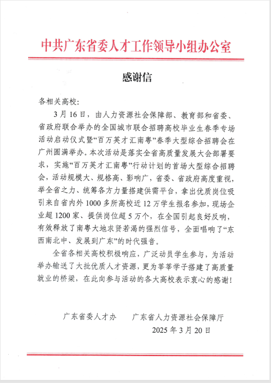 3月16日,由人力资源社会保障部、教育部和省委、省政府联合举办的全国城市联合招聘高校毕业生春季专场活动启动仪式暨“百万英才汇南粤”春季大型综合招聘会在广州圆满举办。我校高度重视此次招聘活动,由学生工作部副部长许斯华带队,组织526名毕业生积极参会,与众多优质企业面对面交流,精准对接就业需求。广东省委人才办、广东省人力资源社会保障厅向我校发来感谢信,对我校本次的组织工作给予了肯定。