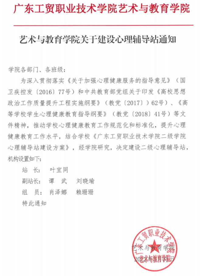 为深入贯彻落实《关于加强心理健康服务的指导意见》(国卫疾控发〔2016〕77号)和中共教育部党组关于印发《高校思想政治工作质量提升工程实施纲要》(教党〔2017〕)62号)、《高等学校学生心理健康教育指导纲要》(教党〔2018〕41号)等文件精神,推动学校心理健康教育工作规范化和标准化,提升心理健康教育工作水平,结合学校《太阳集团城官网1407二级学院心理辅导站建设方案》,经学院研究,3月31日正式成立二级心理辅导站,4月18日已完成挂牌仪式。