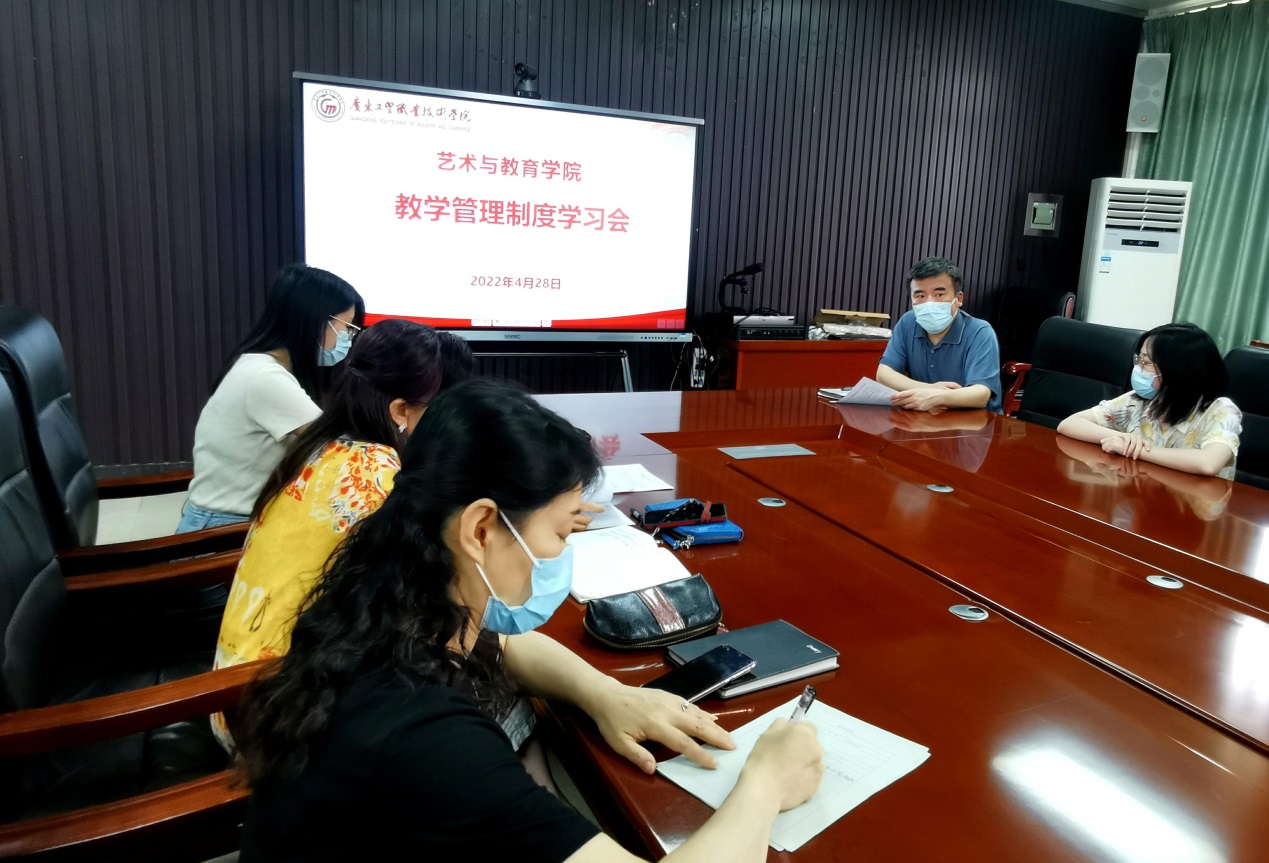 为进一步加强和规范线上教学,维护学校正常的教学秩序,提高课堂教学质量,减少各类教学事故的发生,及时发现并妥善处理教学工作中的各类事故,艺教学院于4月28日下午3:00召开了教学工作会议,会议由主管教学工作的李小燕副院长主讲,学院领导及全体教师按时参加会议,认真学习相关教学管理制度。