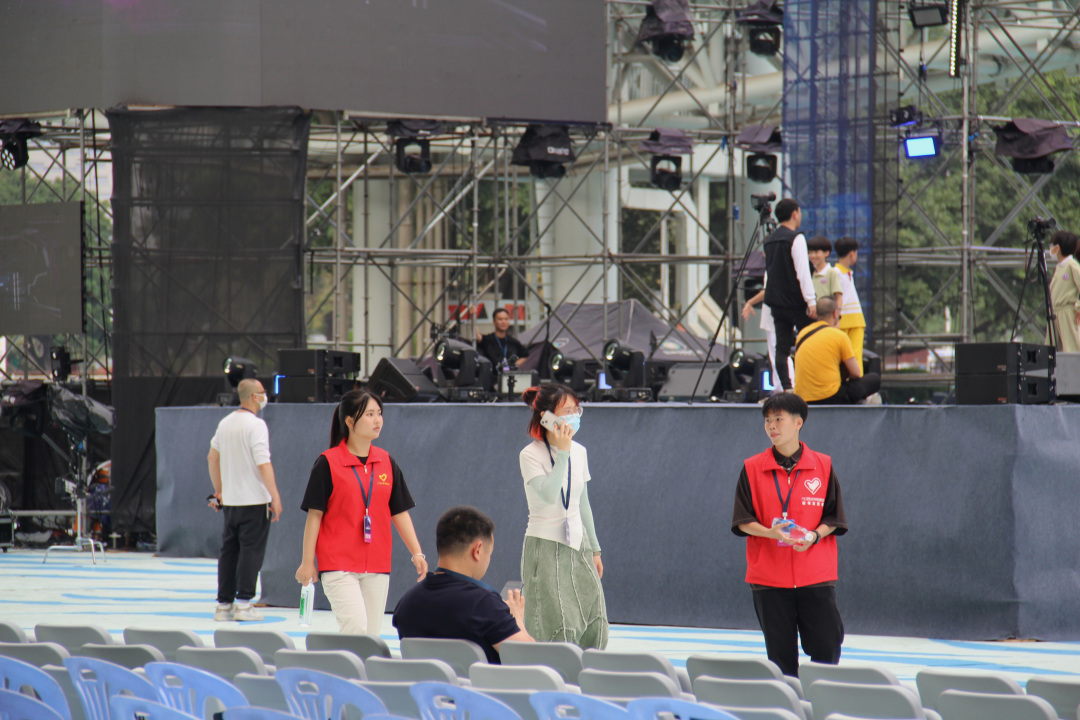 在台前幕后,志愿者们协助工作人员调整音响及话筒,保证了音乐会的舞台能够呈现出完美的效果。
