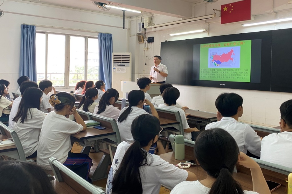 随后,孙师家到笃学楼408课室为荔湾校区的同学们讲授“思政第一课”,主题为《中国共产党的政治灵魂和当前党的奋斗目标》,约50名2023级各班团干部、入党积极分子和共青团员以及思政课教师代表和艺教学院部分教师聆听了本次讲课。